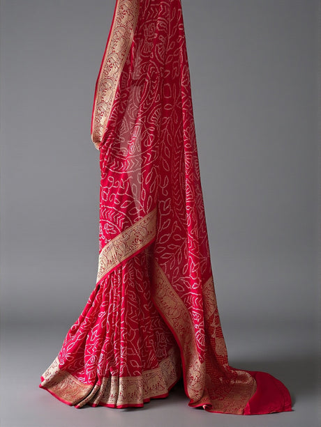 • Georgette: This lightweight, flowing fabric enhances the drape of Bandhani sarees, making it ideal as a party and bridal wear saree. Explore our collection of Pure Banarsi Georgette Bandhani sarees, meticulously handcrafted to elevate your elegance.