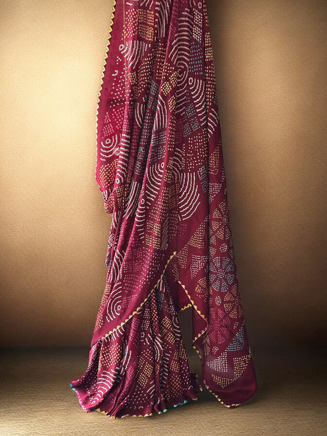 ₹ 13,500.00Unit price /UnavailableGeometric Theme Maroon Pure Gajji Silk Bandhani Saree