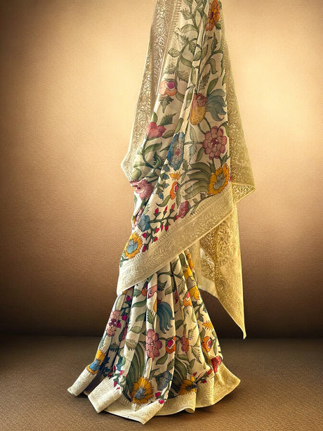 Beige Desi Tussar Silk Floral Kalamkari Saree
