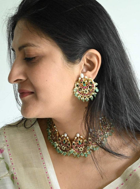 ₹ 27,000.00Unit price /UnavailableGulnaar Pearl Kundan Setting Handcrafted 92.5 Silver Choker with Earrings