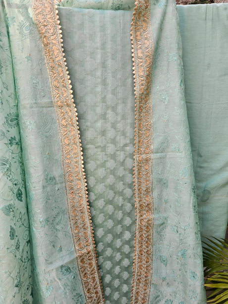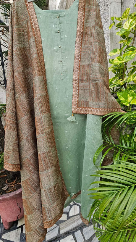 ₹ 12,000.00Unit price /UnavailableGreen 3 Piece Cotton Silk Unstitched Suit Set with Organza Dupatta
