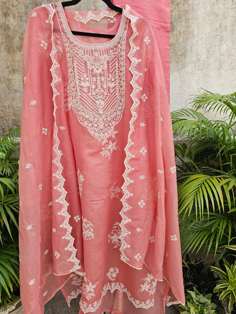 ₹ 4,500.00Unit price /UnavailableElegant Pink Floral Machine Embroidered Three Piece Chanderi Mulmul Semi Stitched Suit Set