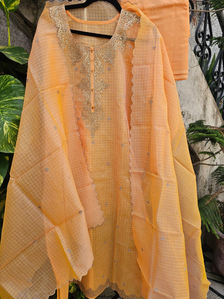 ₹ 6,500.00Unit price /UnavailableElegant & Subtle Light Orange Semi Stitched Kota Embroidered Suit Set