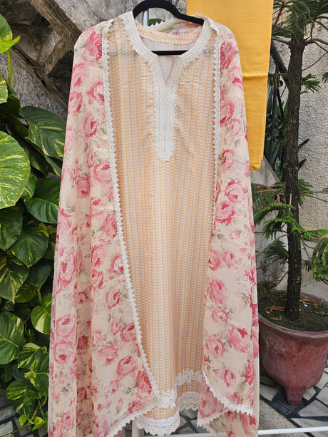 ₹ 9,000.00Unit price /UnavailableMango Yellow Semi Stitched Three Piece Suit Set with Crepe Top and Kota Dupatta