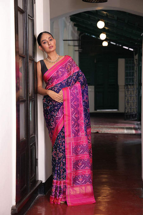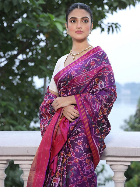₹ 38,000.00Unit price /UnavailableExquisite Handloom Violet and Pink Mulberry Silk Ikat Patola Saree with Intricate Navratna Motif