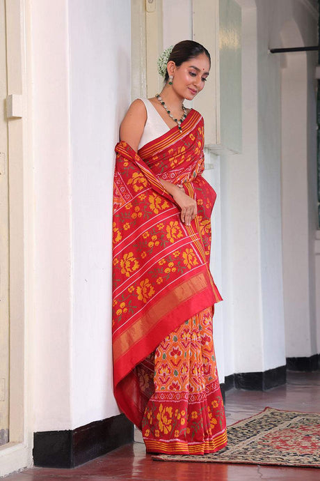 ₹ 38,000.00Unit price /UnavailableElegant Handloom Peach and Red Mulberry Silk Ikat Patola Saree with Floral Motifs