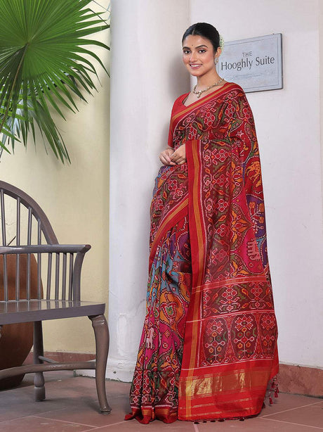 Graceful Handloom Brown and Red Mulberry Silk Ikat Patola Saree with Tiger and Elephant Motifs