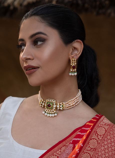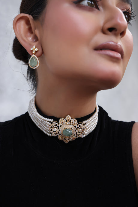 ₹ 33,075.00Unit price /UnavailableHandcrafted Choker with Emerald Doublet clubbed with Moissanite Polki Earrings