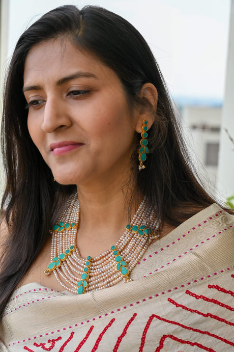 ₹ 44,100.00Unit price /UnavailableMinimal Majesty - Handcrafted Choker with Pearls clubbed with Carved Green Aventurine Earrings