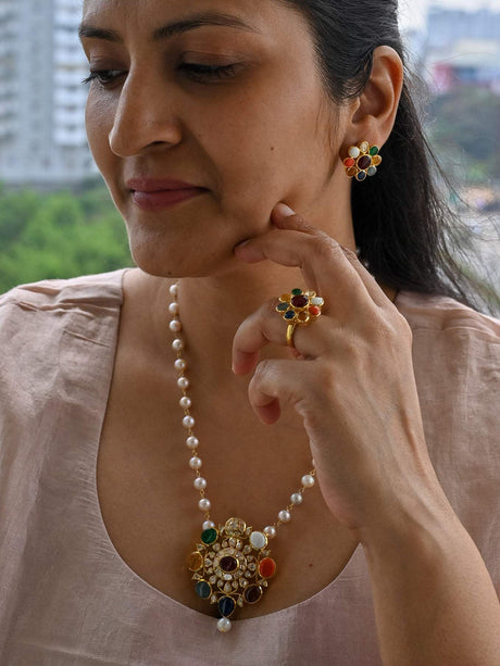 ₹ 19,430.00Unit price /UnavailableHandcrafted 92.5 Silver Navratna Pendant Necklace, Earrings and Ring