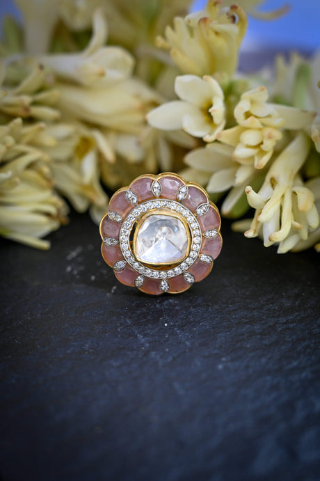 Handcrafted Adjustable 92.5 Silver Ring with Moissanite polki and Imitation Rose Quartz