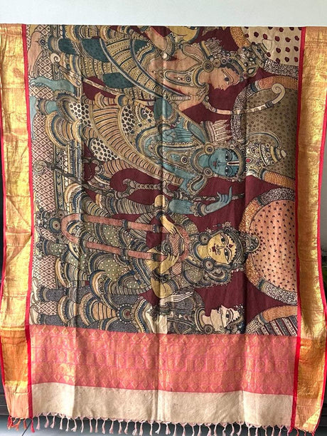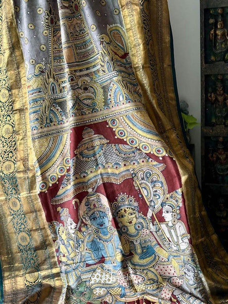 ₹ 15,725.00₹ 18,500.00Unit price /UnavailableLord Ram and Devi Sita Swayamvar Theme Handloom Kanchi Pattu Kalamkari Dupatta