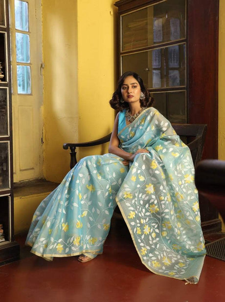 Super Exclusive Blue Colour Handloom Muslin Silk Saree with Jamdani weaving
