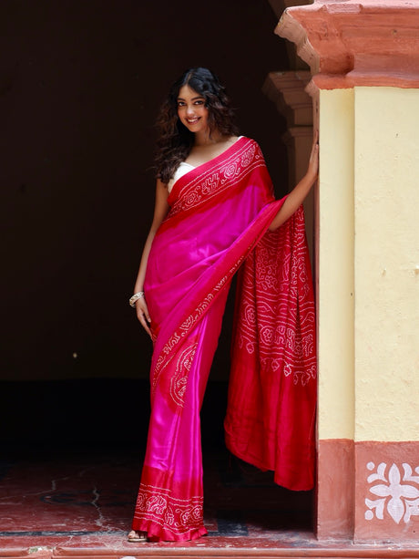 ₹ 17,000.00Unit price /UnavailableVibrant Pink and Red Circular Theme Pure Gajji Silk Bandhani Saree