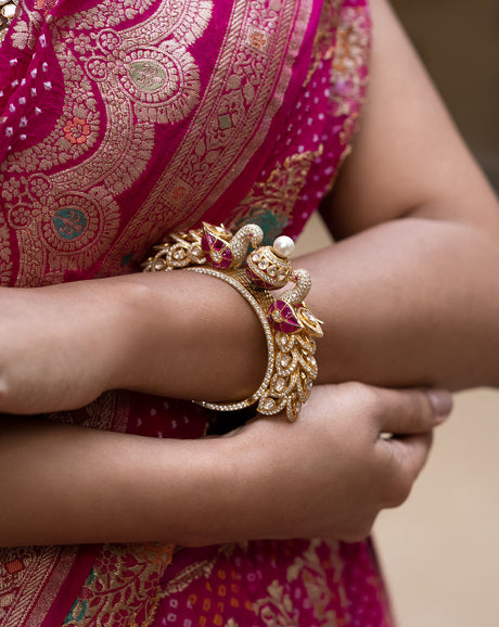 ₹ 68,985.00Unit price /UnavailableExtravagant Peacock Theme 92.5 Silver Kada with Moissanite Polki and Imitation Rubies