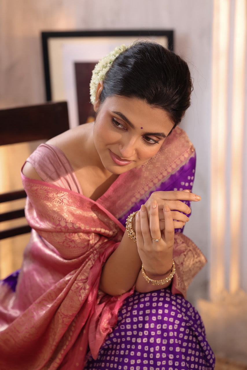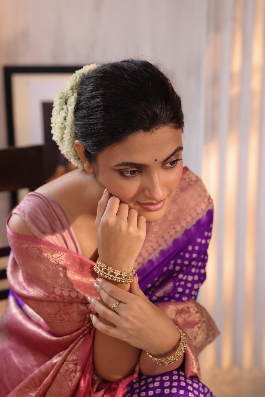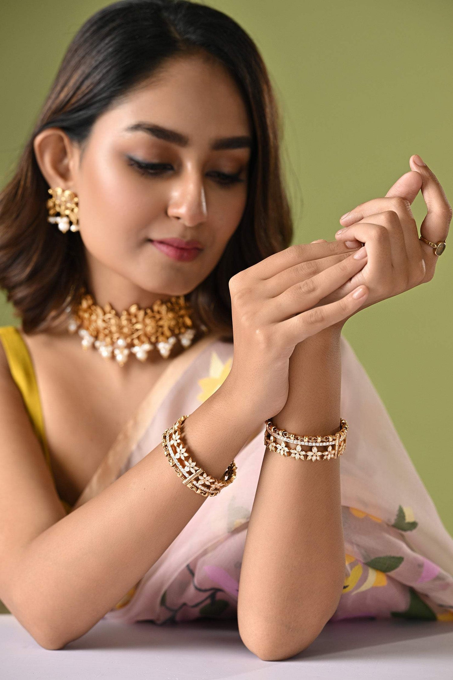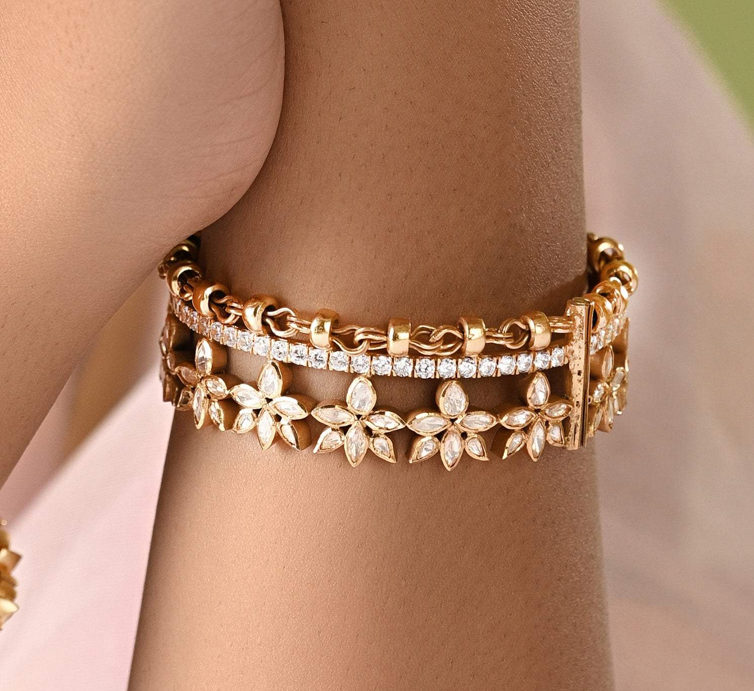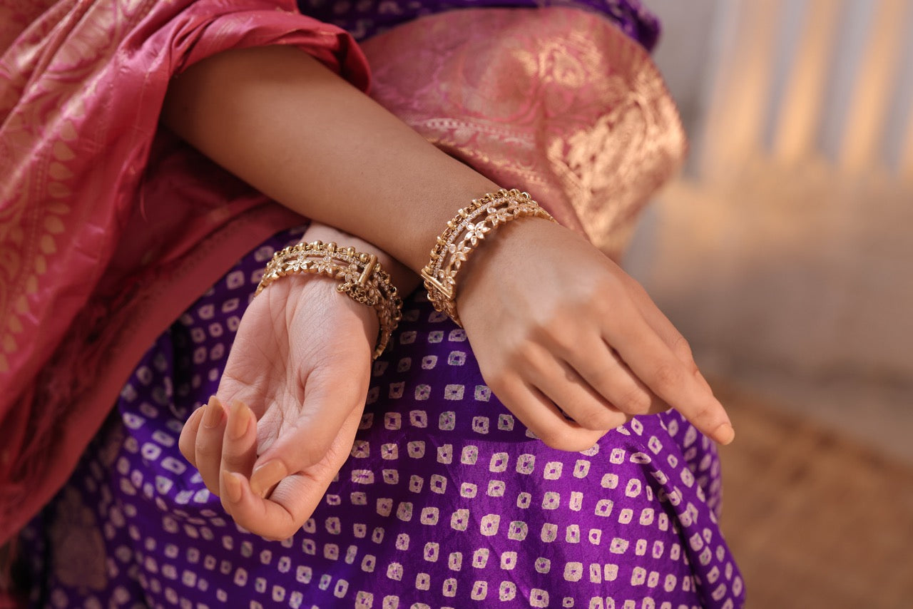 The openable kadas are beautifully designed with 92.5 silver and small intricate details. They feature floral motifs, giving them an elegant and traditional look. The bangles are adorned with moissanite polki and zircons, adding a touch of sophistication and enhancing the overall luxurious feel of the jewelry. The design is delicate and opulent, making the kadas suitable for casual, festive, or wedding occasions.