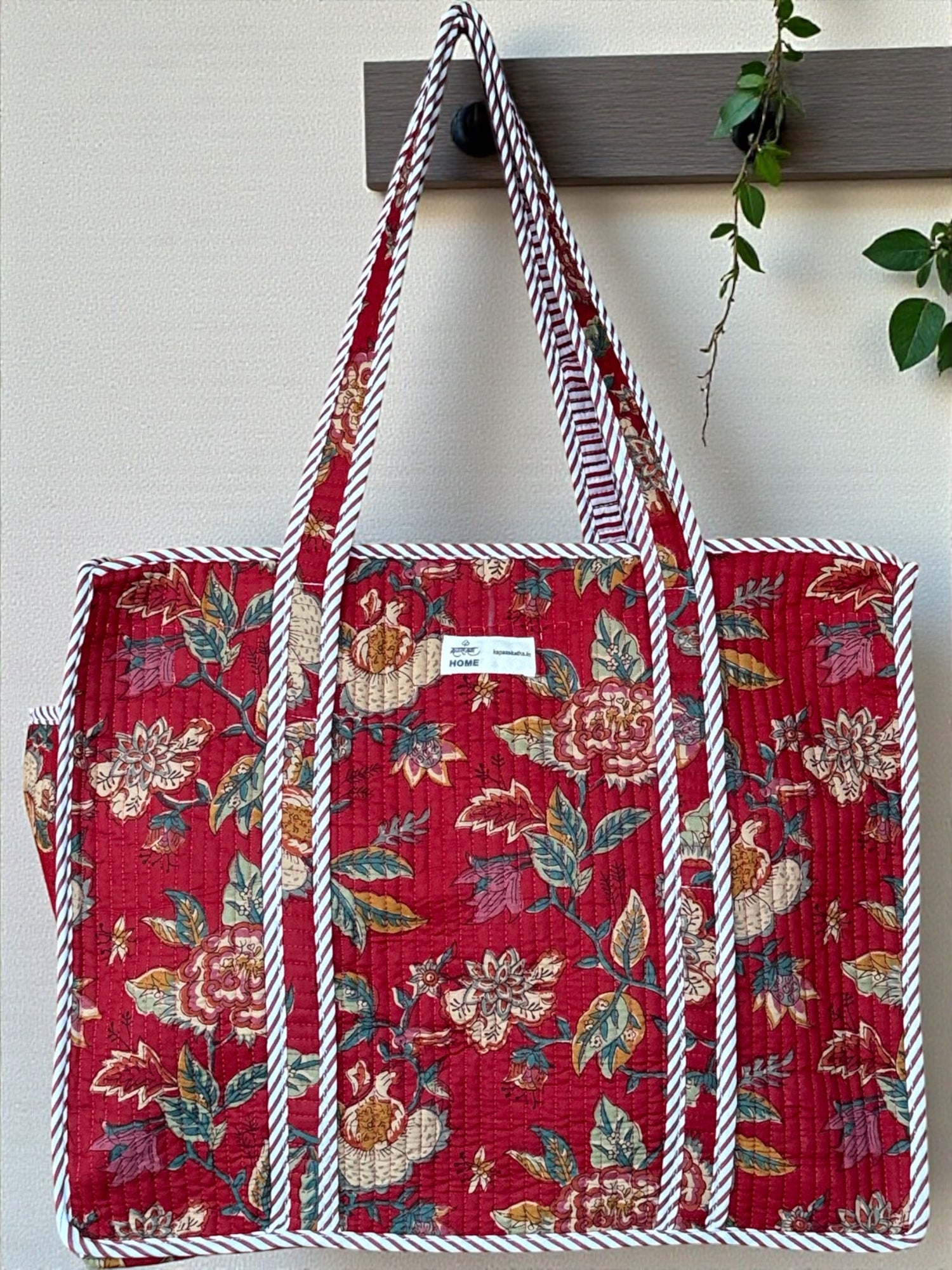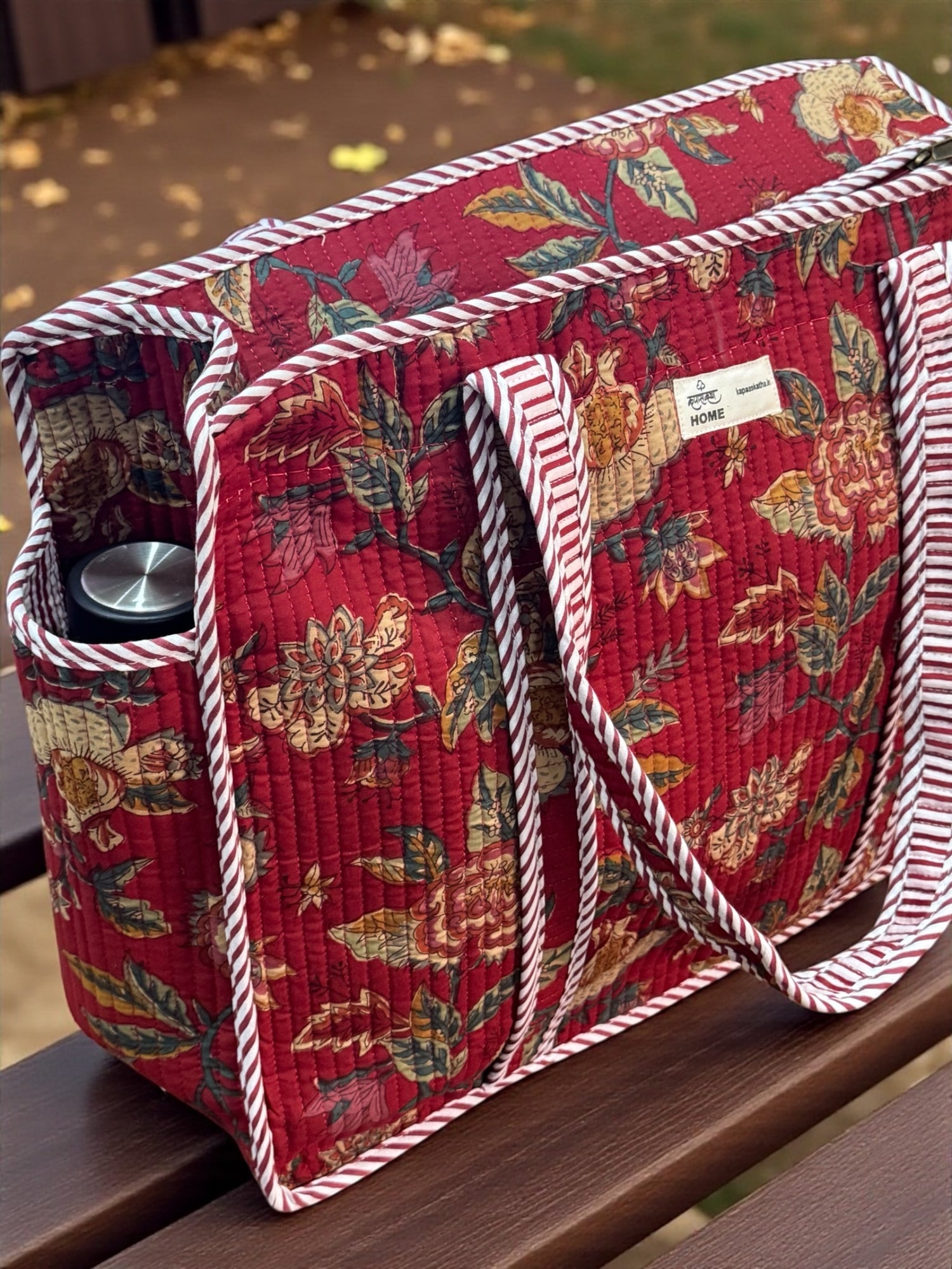 This vibrant, handcrafted red cotton tote bag with colorful floral designs is a perfect blend of functionality and artistic charm, aptly described as the Beautiful Floral Cotton Carryall. The rich red base amplifies the intricate blossoms, creating a lively yet timeless elegance that easily catches everyone's attention. Thoughtfully crafted from soft, durable cotton, it offers a roomy interior ideal for daily essentials at work, casual outings, or even traveling.