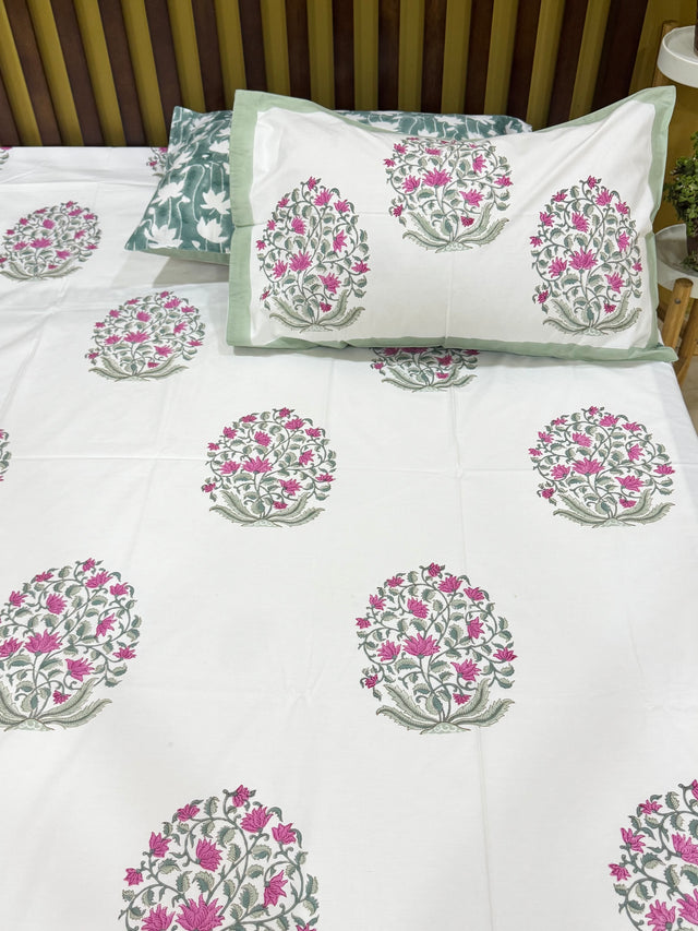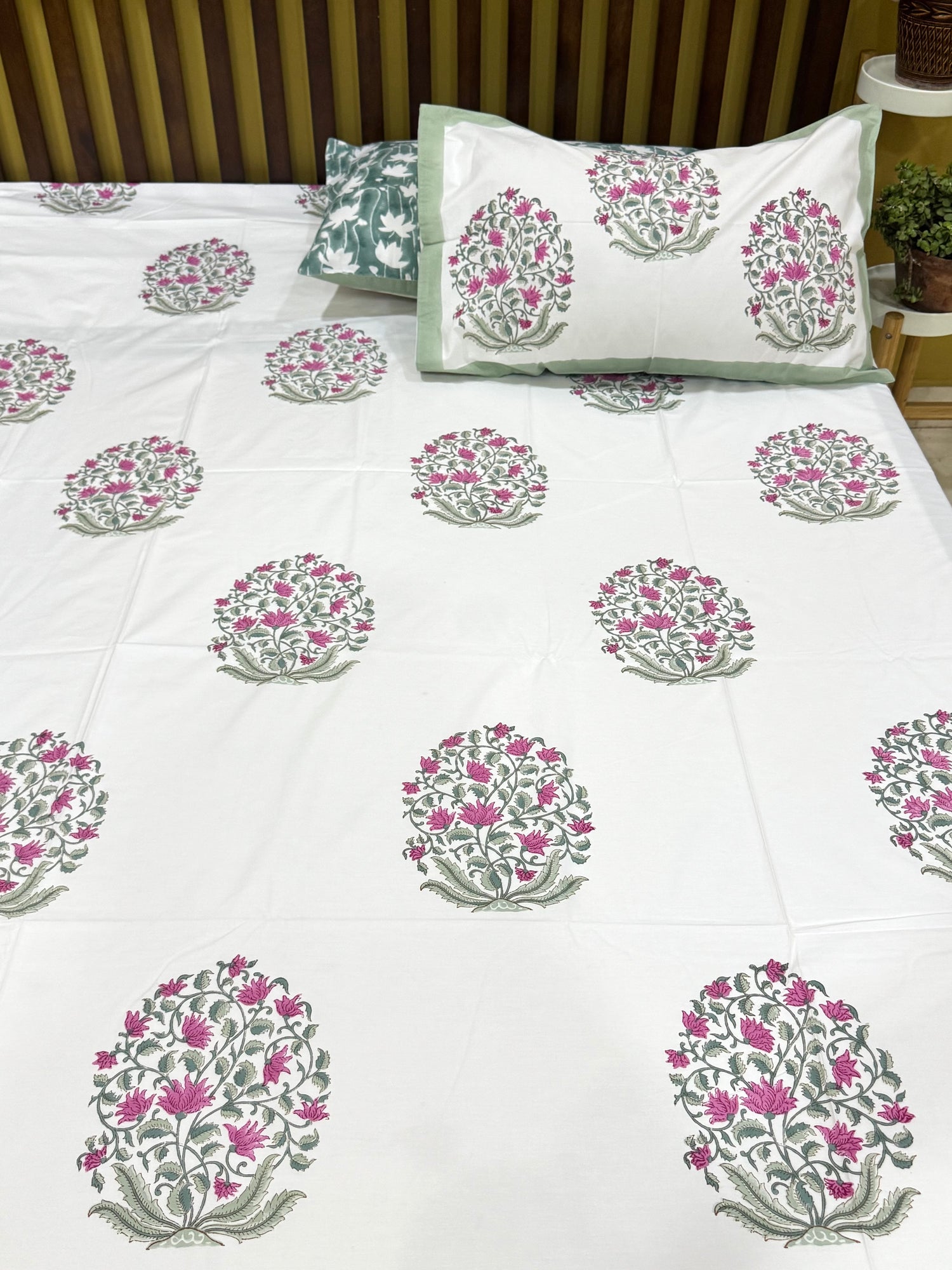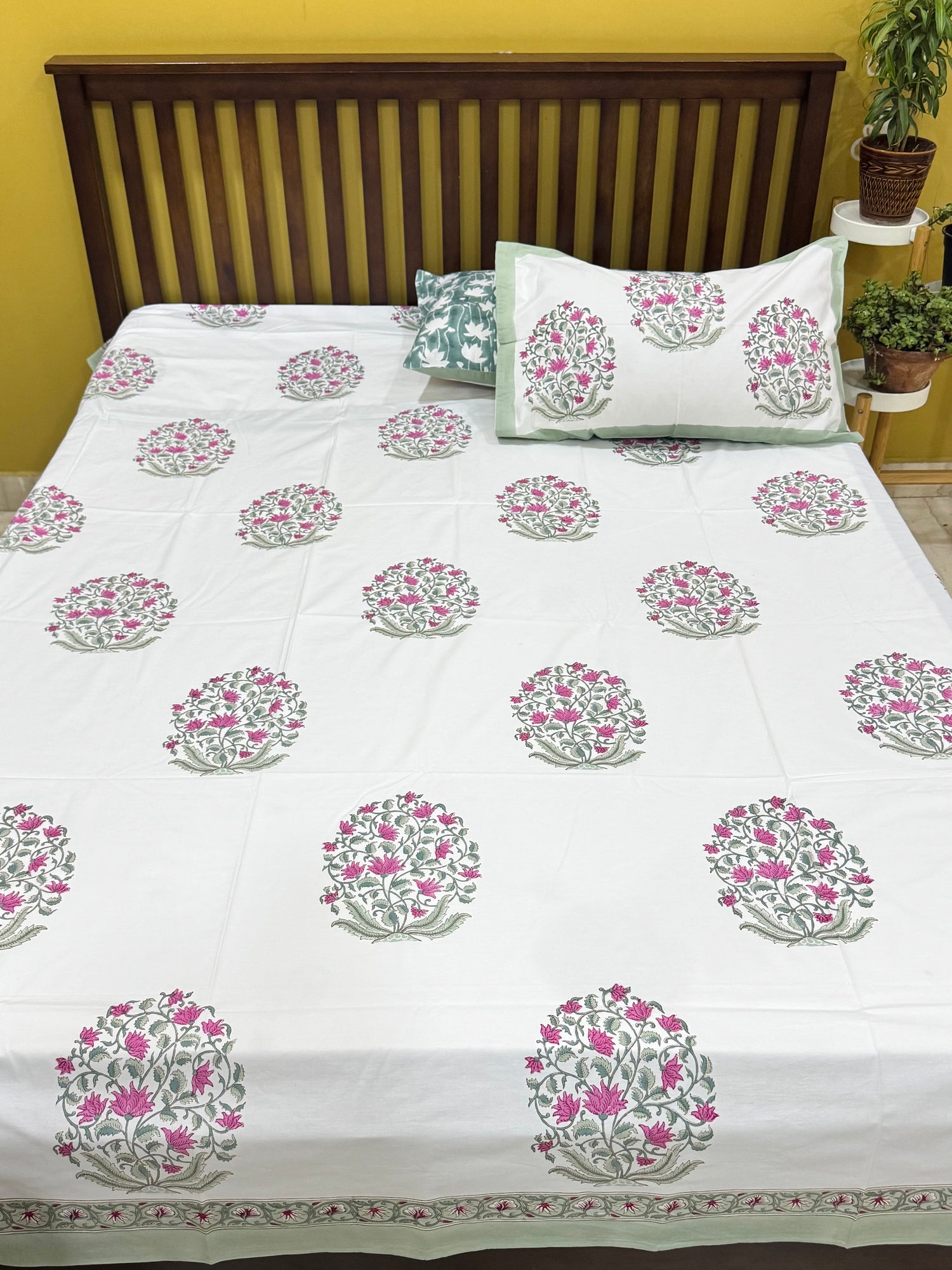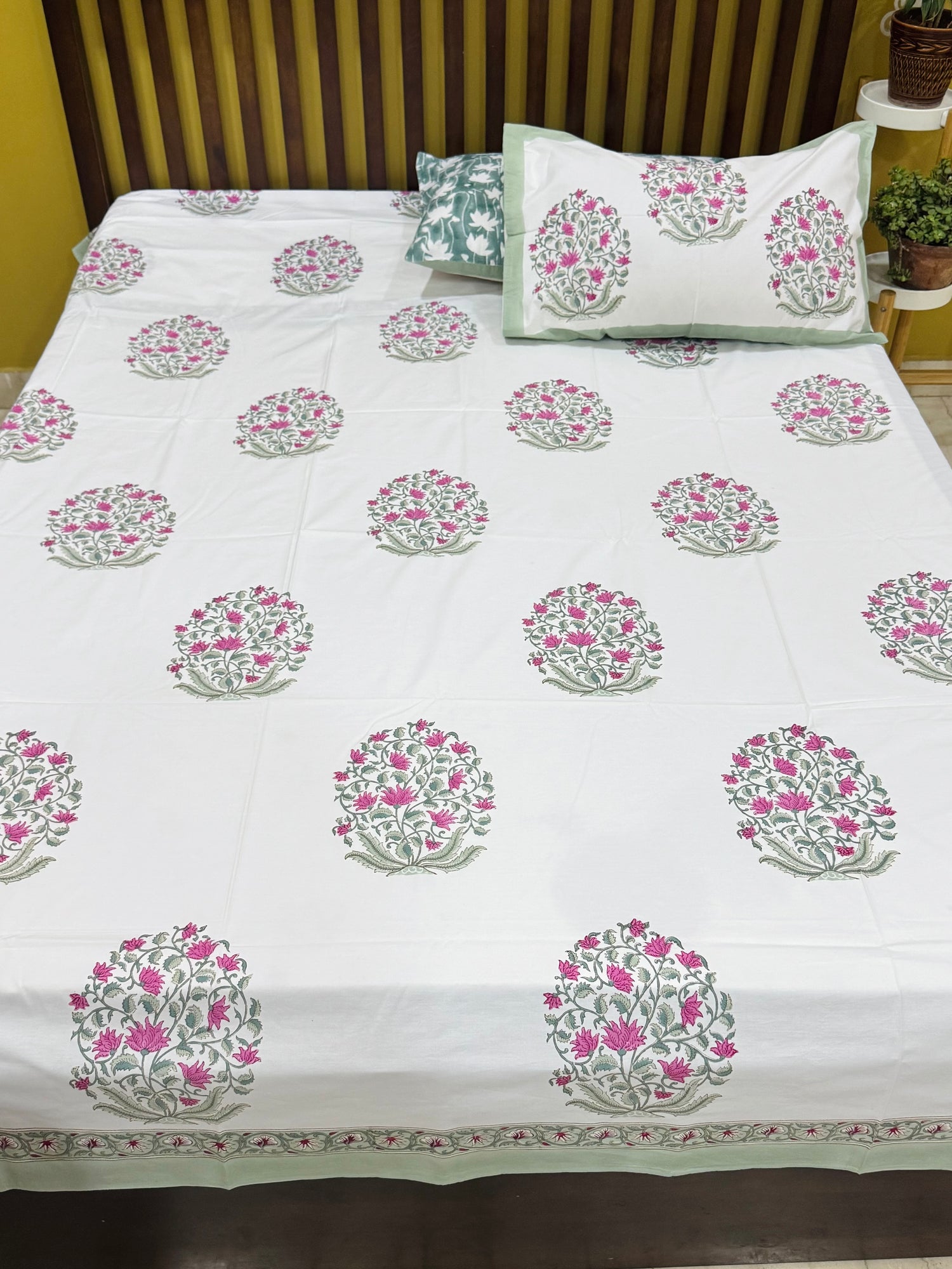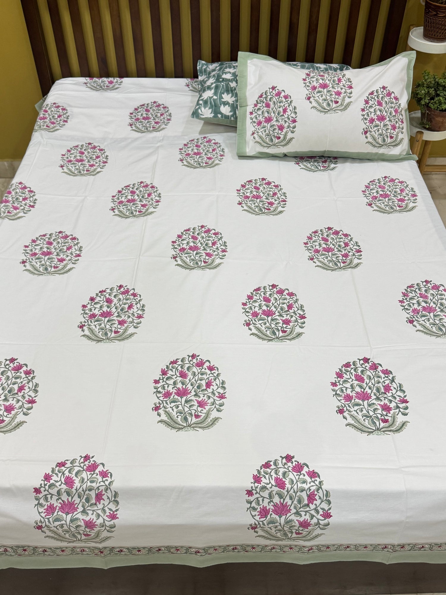 Hand Block Printed Cotton bedsheet with the pillow covers. The bedsheet is made by the artisans of Rajasthan using azo-free dyes.