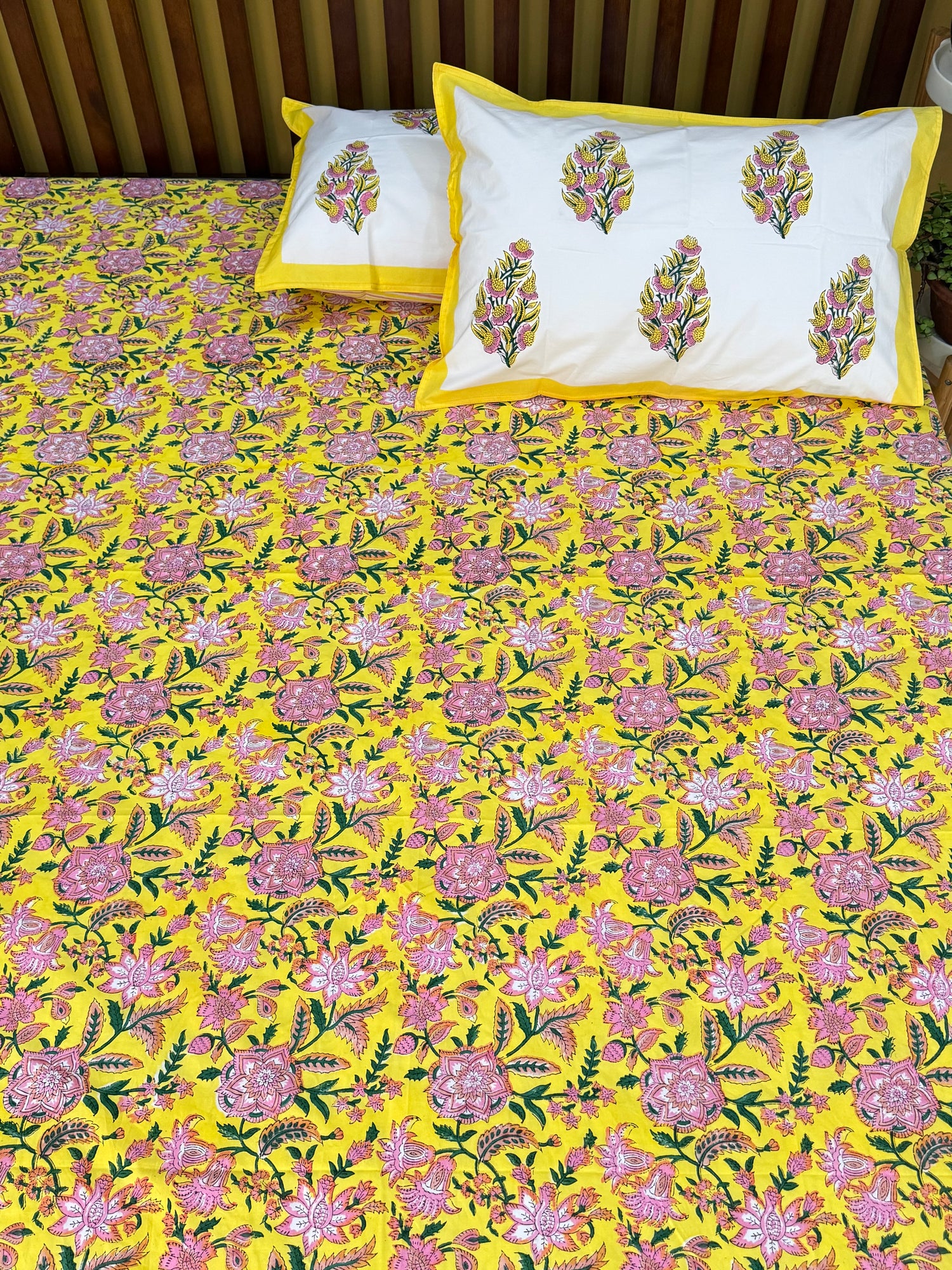 Sanganeri Hand Block Printed Cotton bedsheet with pillow covers. The bedsheet is made by the artisans of Rajasthan using azo-free dyes.