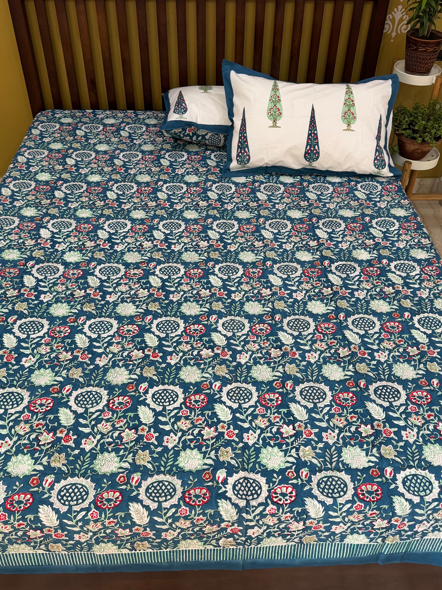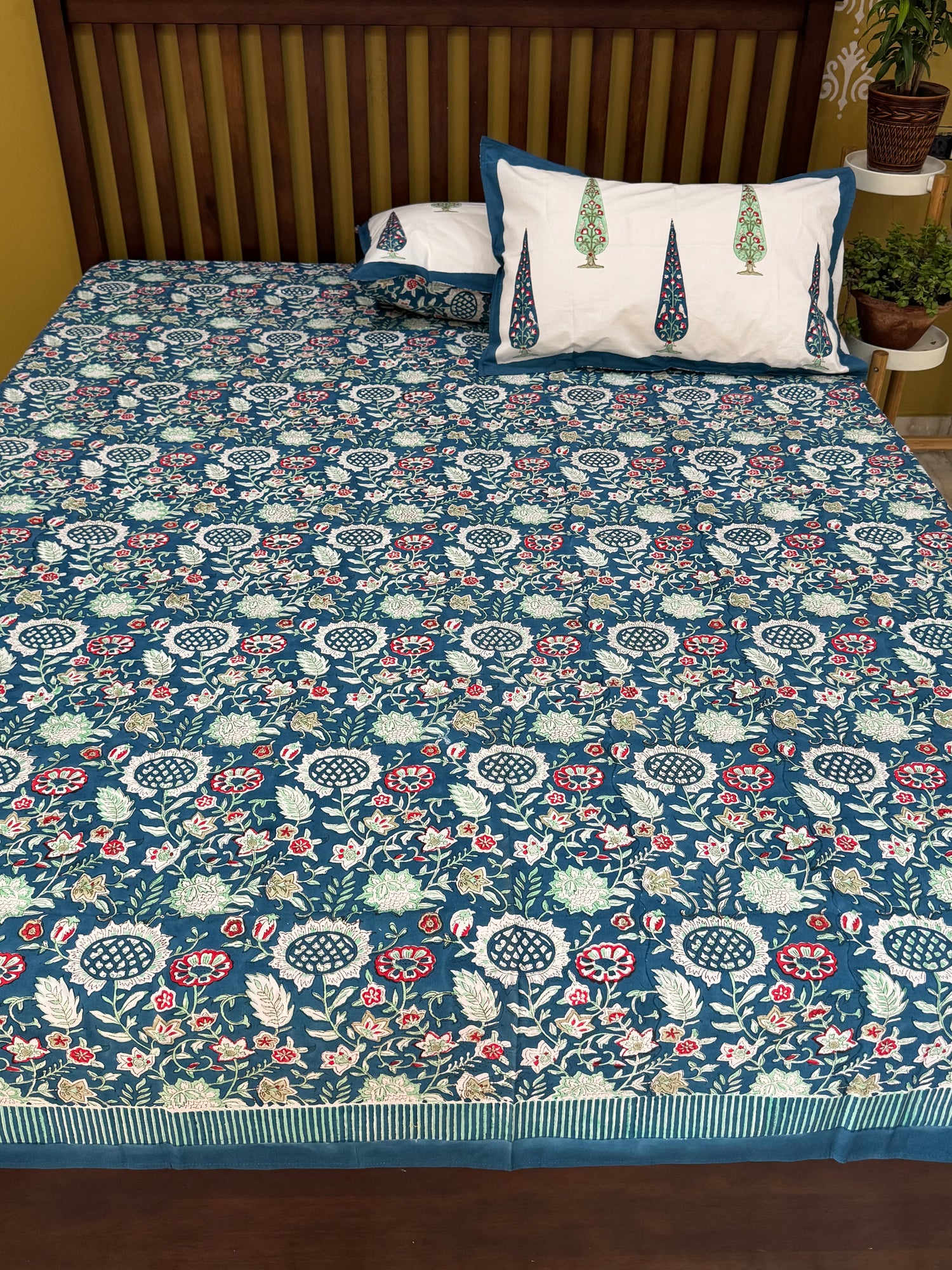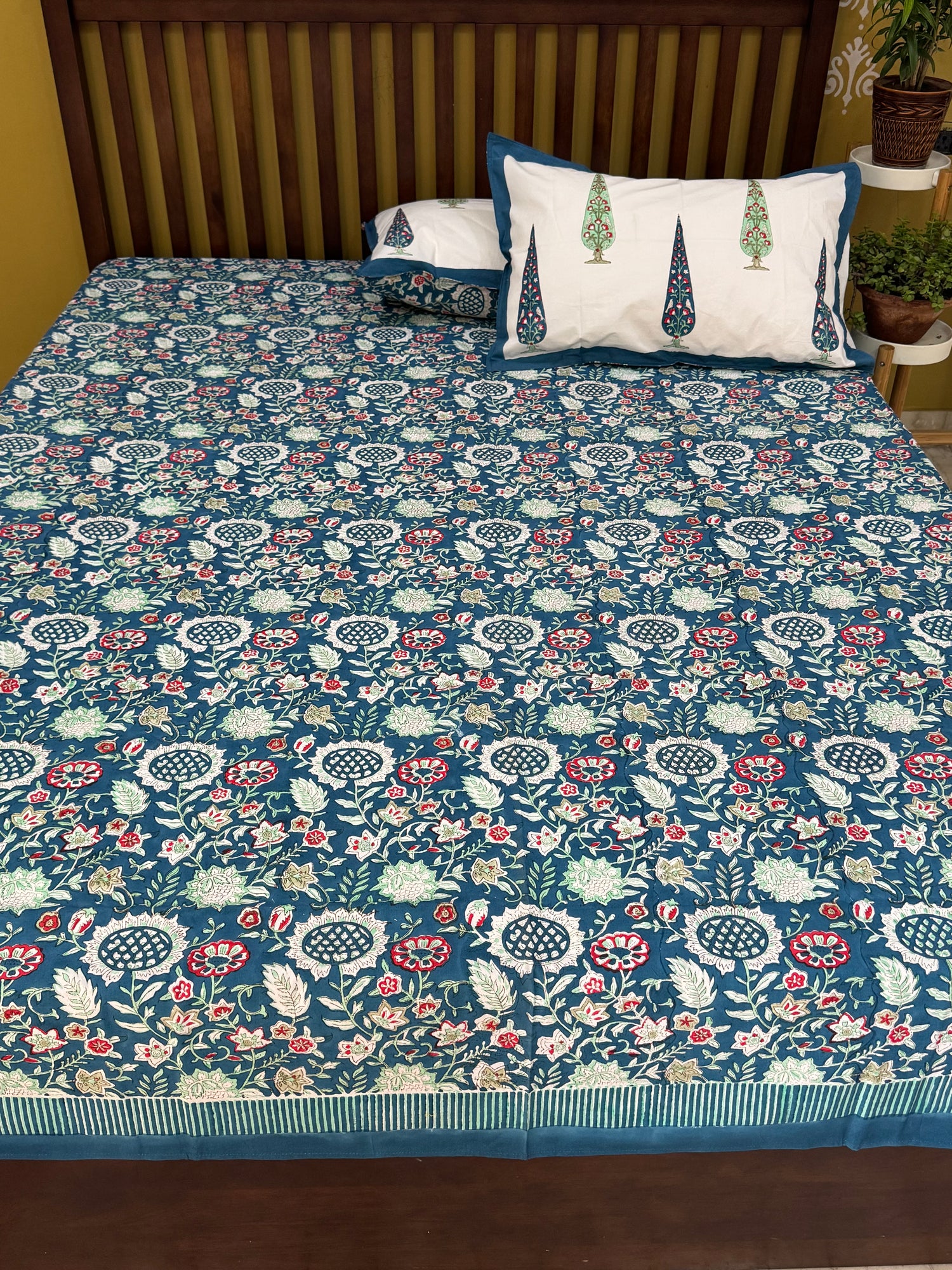 Sanganeri Hand Block Printed Cotton bedsheet with pillow covers. The bedsheet is made by the artisans of Rajasthan using azo-free dyes.