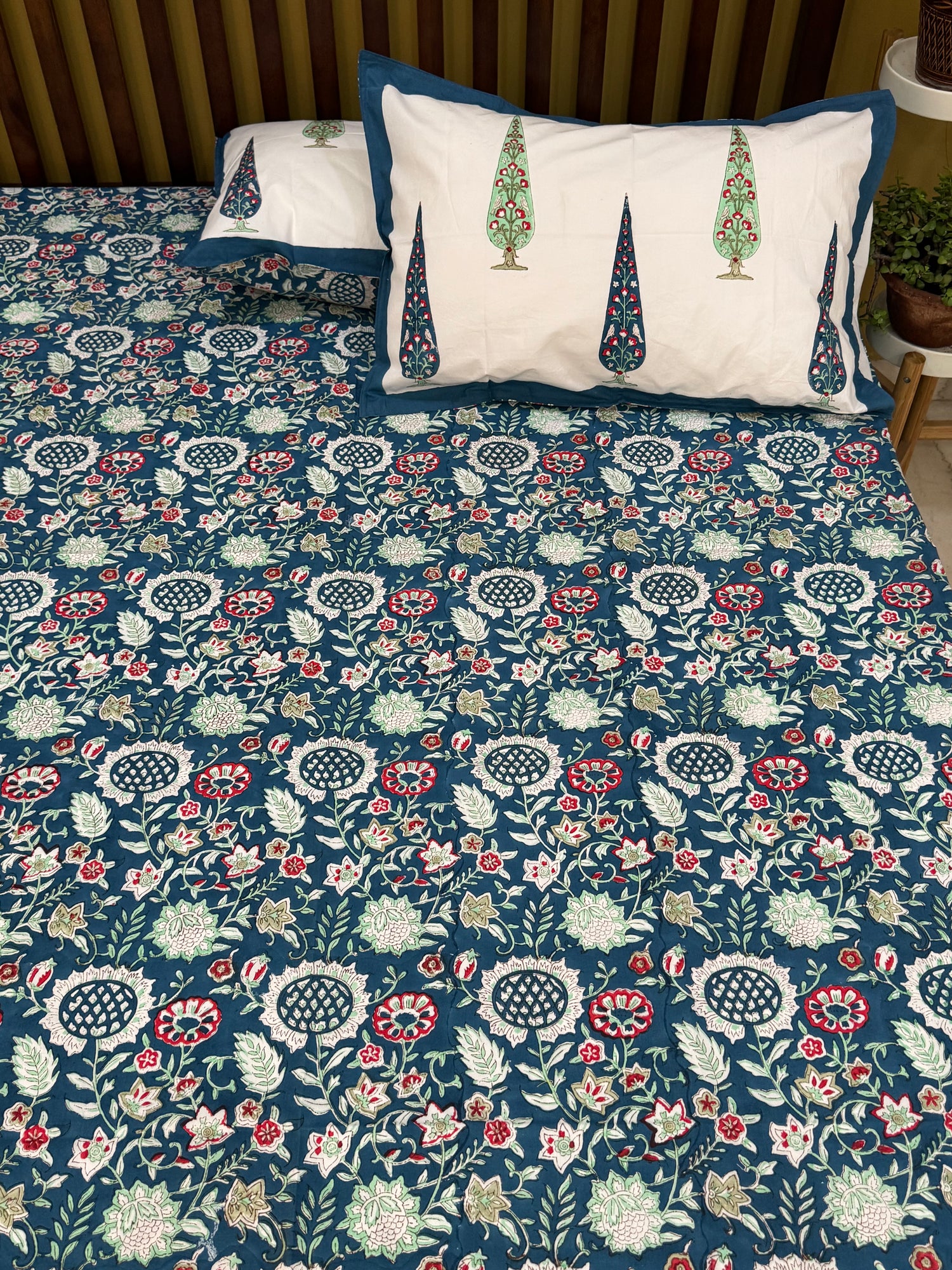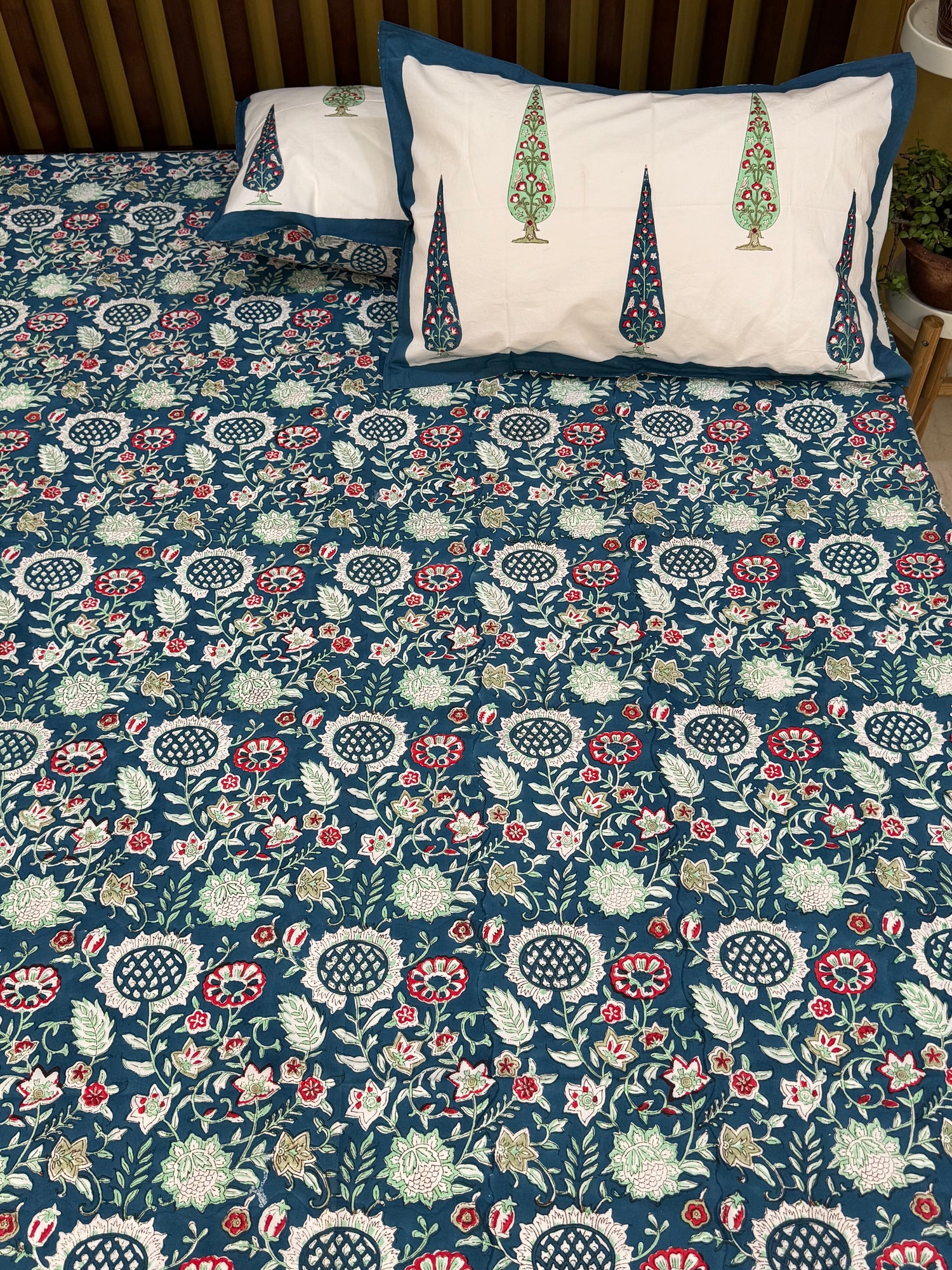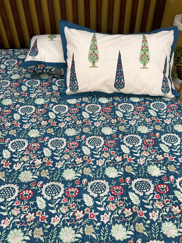 Sanganeri Hand Block Printed Cotton bedsheet with pillow covers. The bedsheet is made by the artisans of Rajasthan using azo-free dyes.