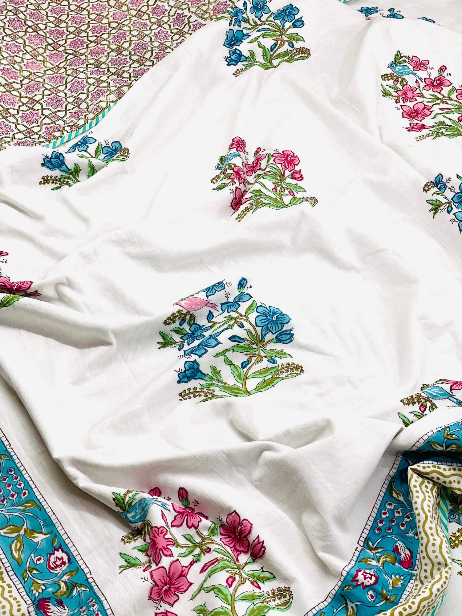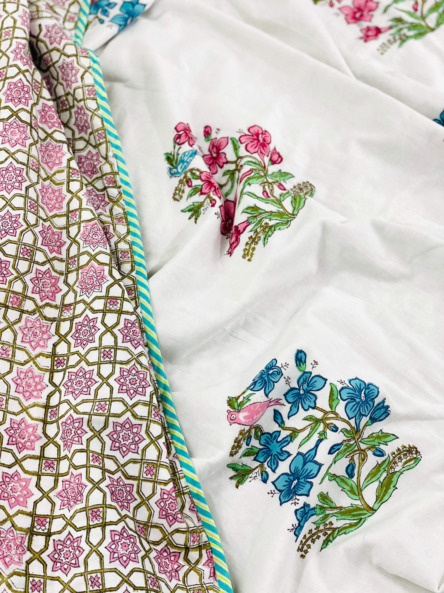 Reversible Hand Block Printed soft Cotton double bedsize dohar layered with a warm flannel. Crafted by the artisans of Rajasthan using azo-free dye.