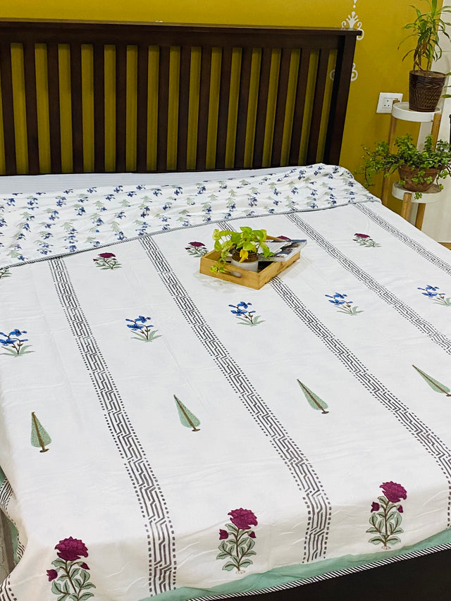 Reversible Hand Block Printed Soft Cotton double bed size dohar layered with a warm flannel. Crafted by the artisans of Rajasthan using azo-free dye.