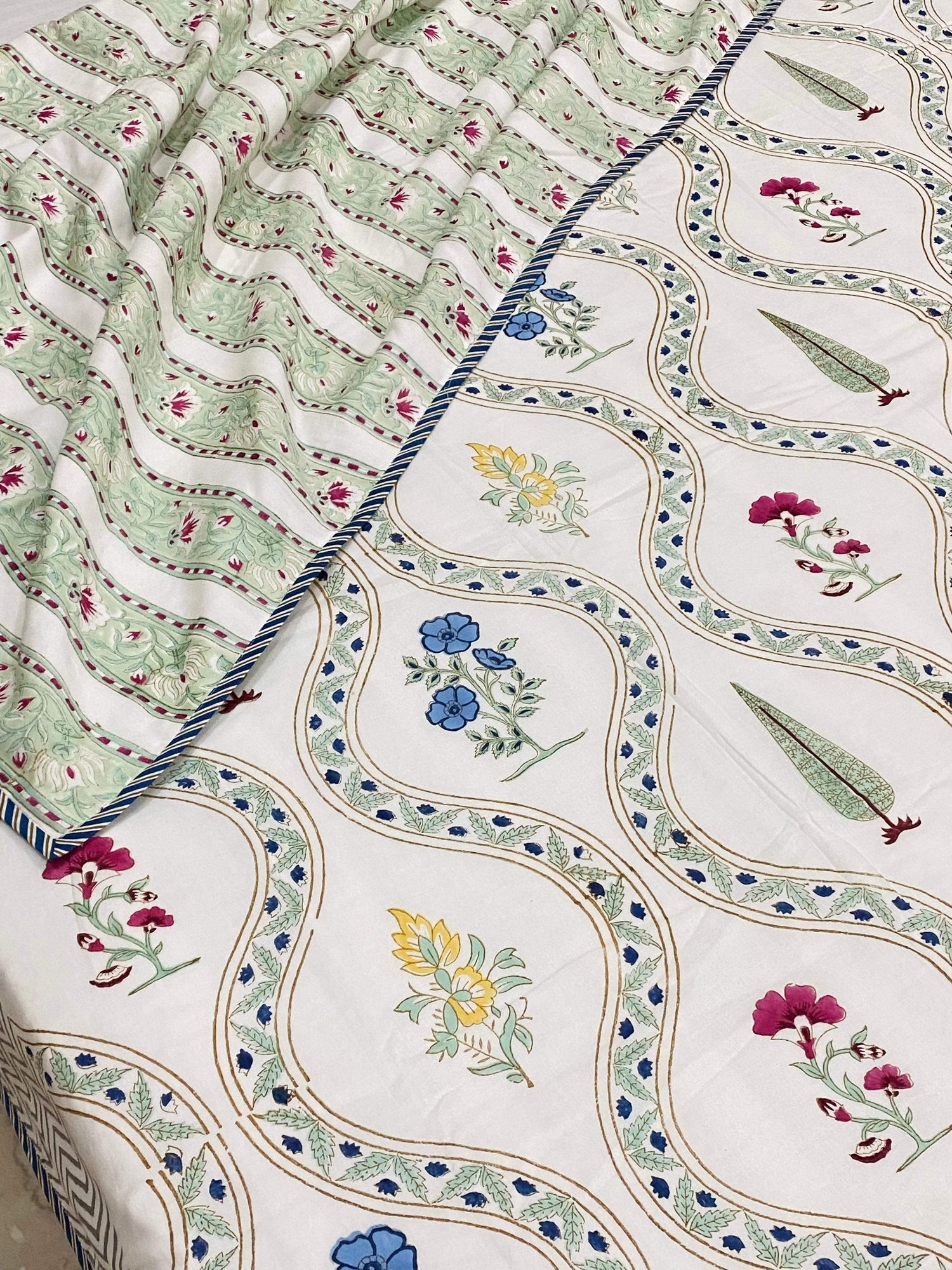 Sanganeri Reversible Hand Block Printed soft Cotton double bedsize dohar layered with a warm flannel. Crafted by the artisans of Rajasthan using azo-free dye.