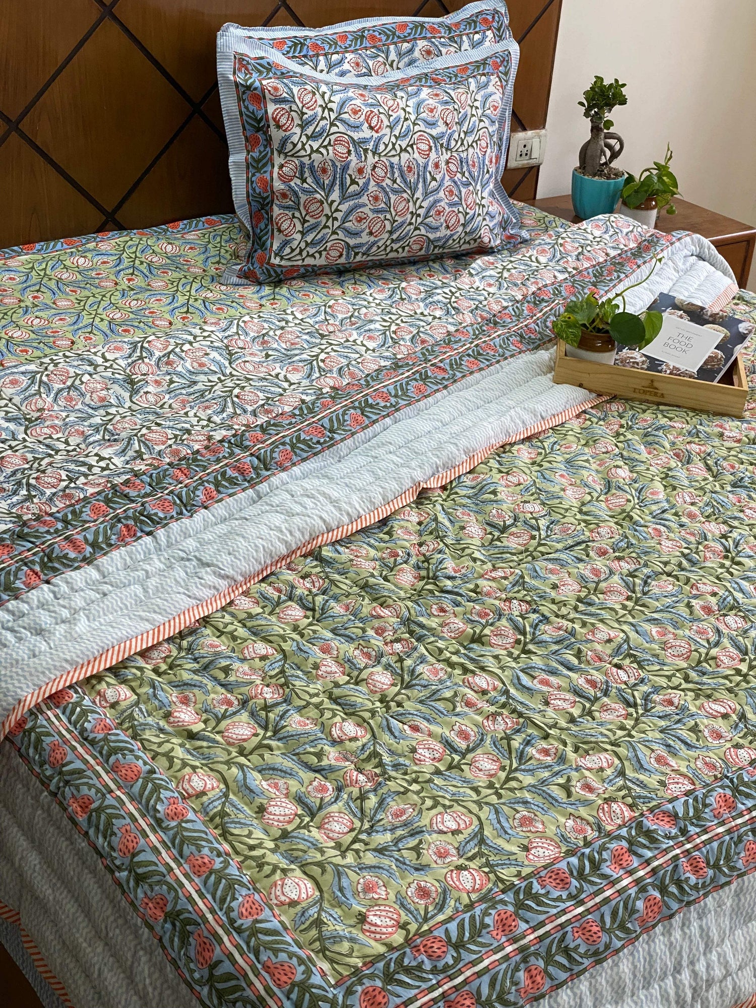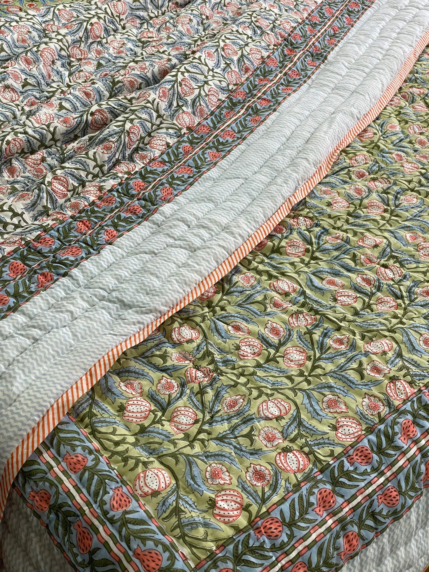 Hand Block Printed Cotton Reversible quilt/comforter. The quilt is made by the artisans of Rajasthan using azo-free dyes.