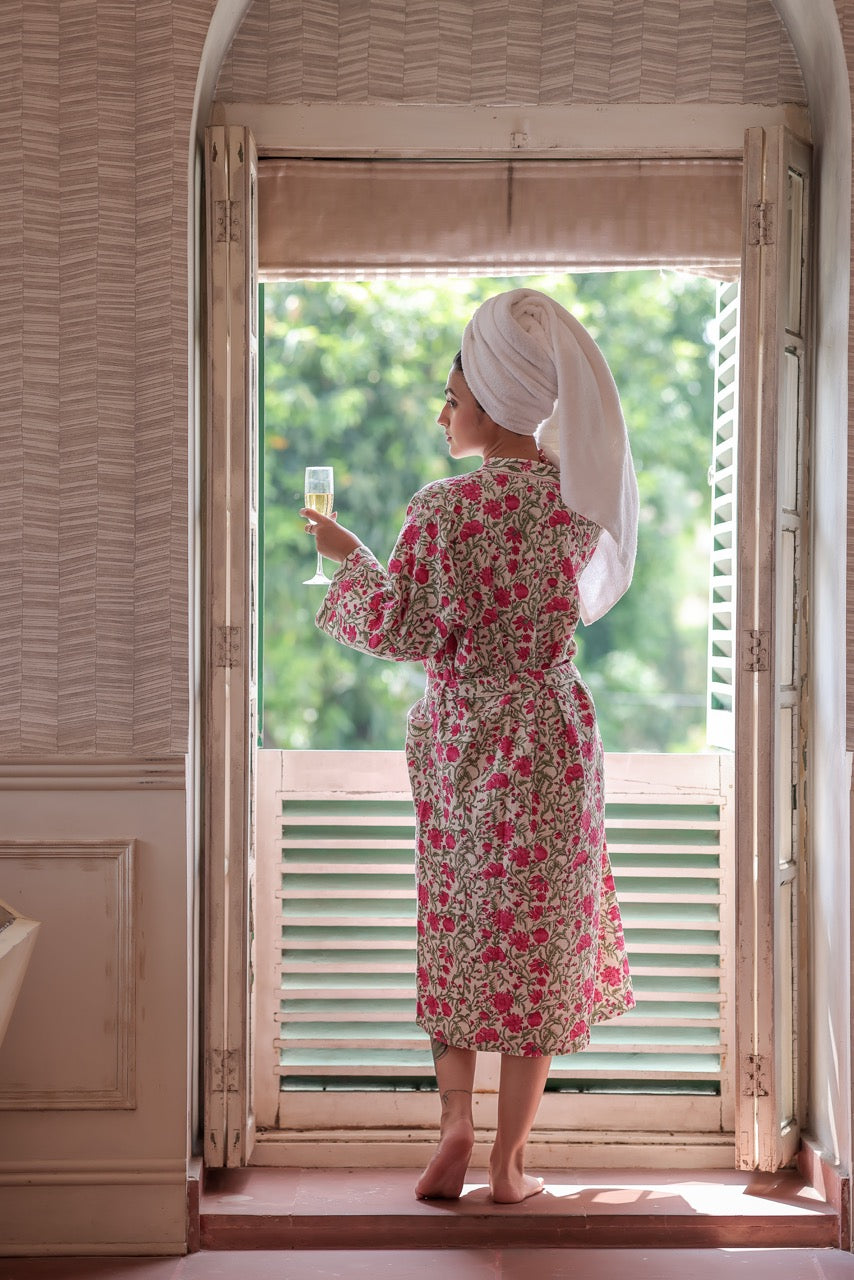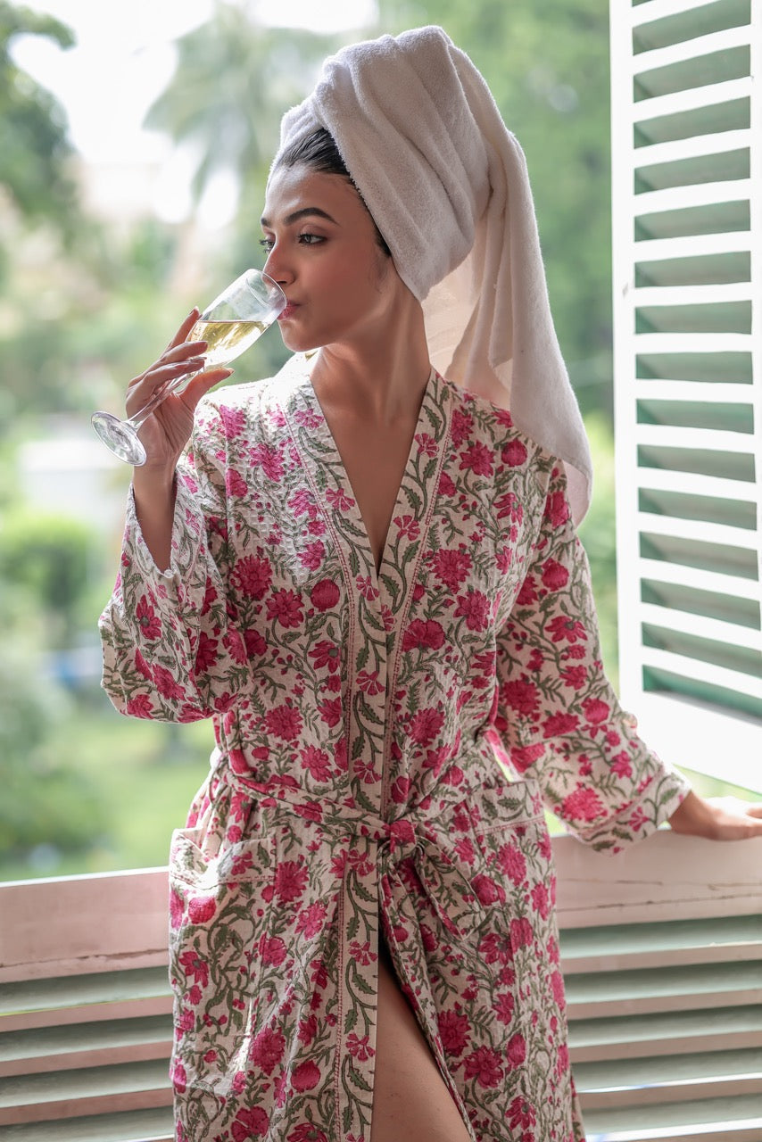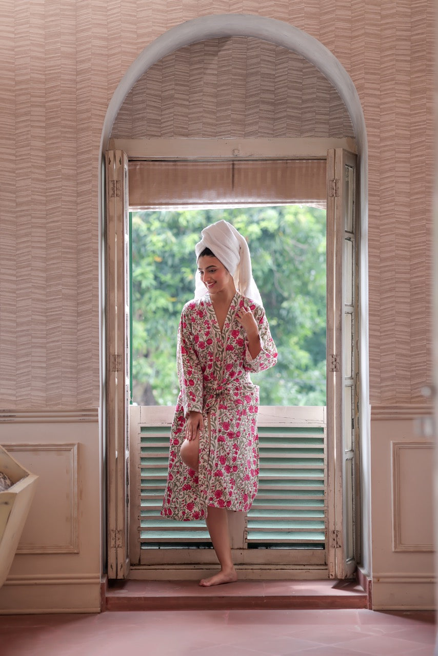 Brighten your mornings with the refreshing charm of the Pink flowers Waffle Cotton Robe. Adorned with vibrant handblock-style floral motifs in shades of pink and green on a soft ivory base, this robe is crafted from breathable, textured waffle cotton. It features a wrap silhouette with a tie-up belt and roomy sleeves—perfect for slow starts, skincare rituals, or lounging in laid-back elegance.