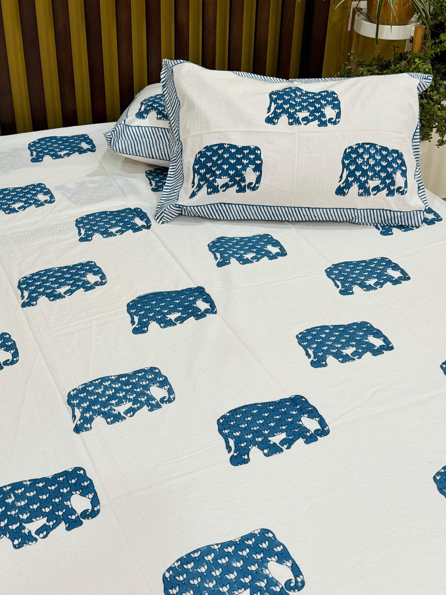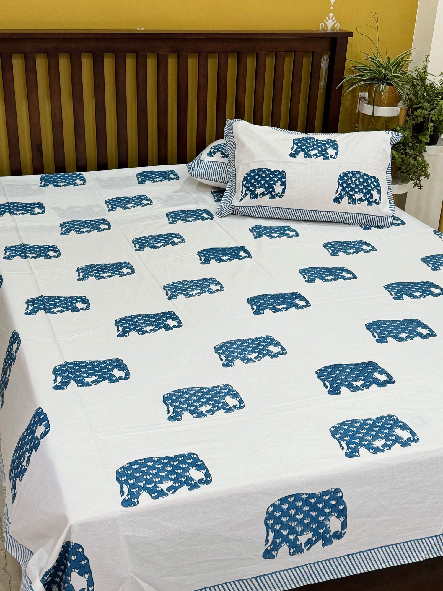 Blue Elephants Handblock Printed Kids Cotton Bedsheet