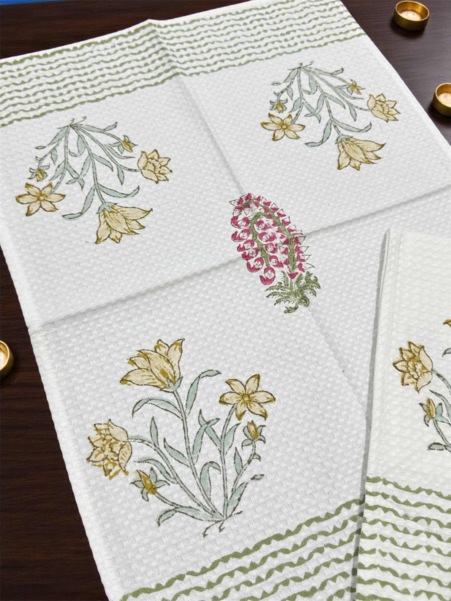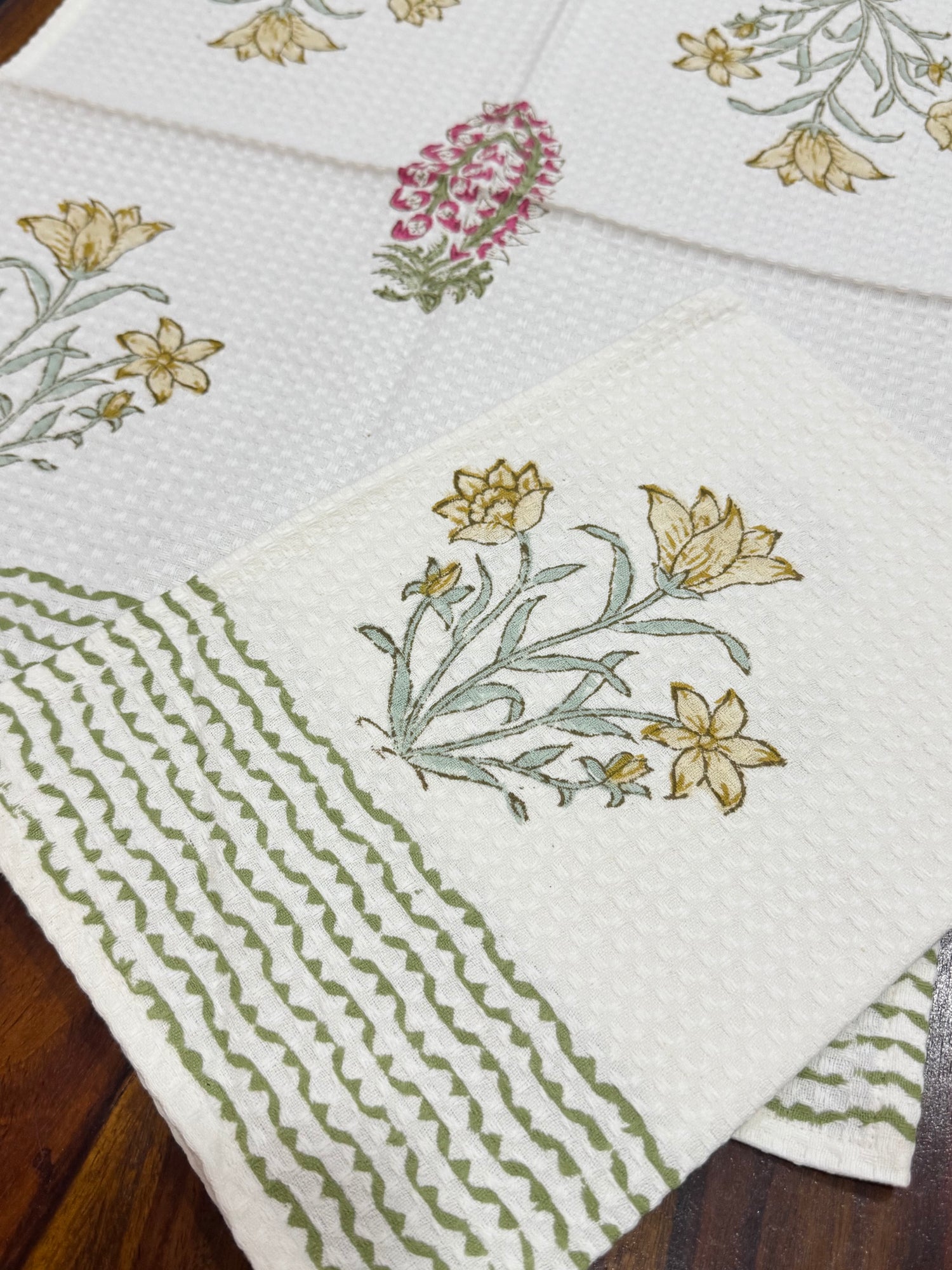 Designed for those who prefer understated elegance, this hand towel features light yellow floral block prints on a serene off-white waffle base. The delicate color palette exudes a gentle brightness that feels airy and refreshing in any setting. Crafted from waffle-textured cotton, the towel absorbs moisture efficiently while staying light, soft, and quick-drying, ideal for regular household use.