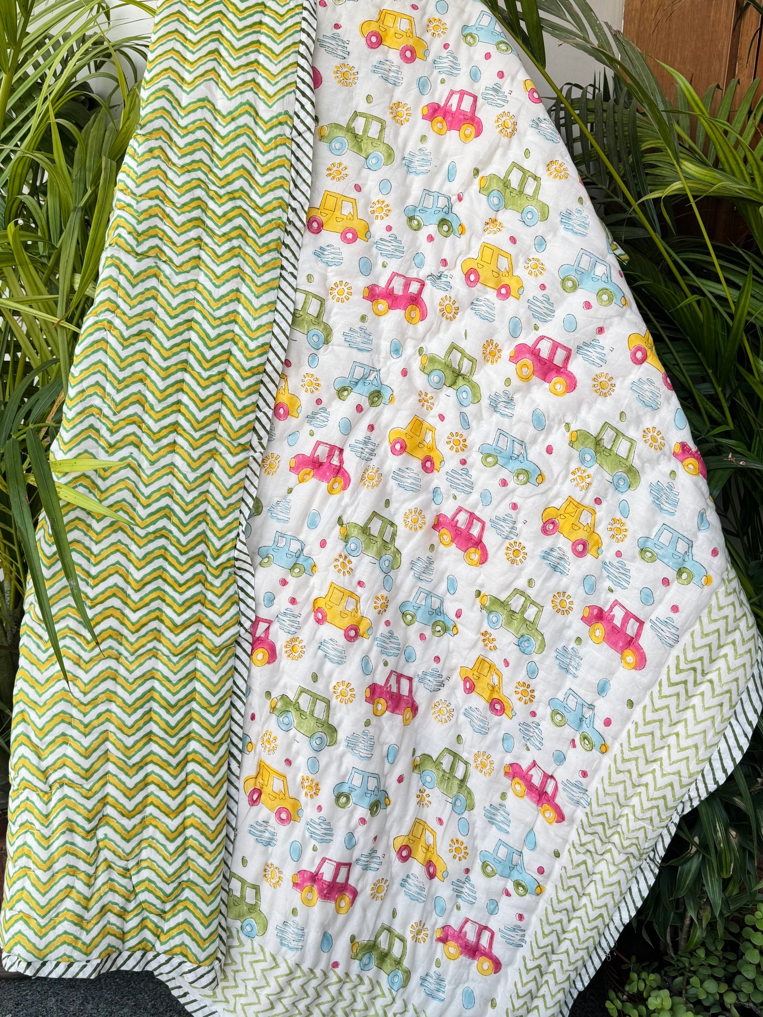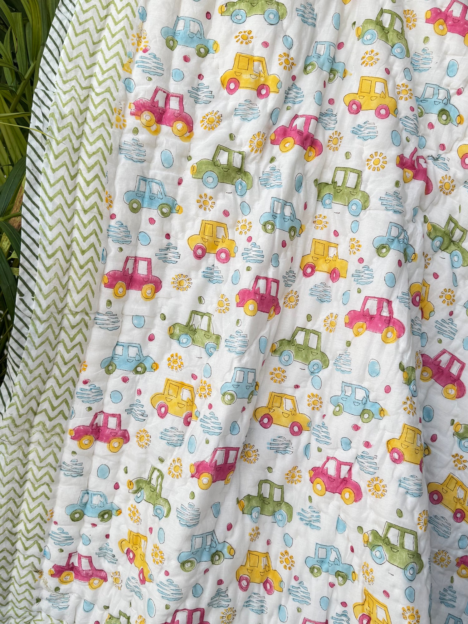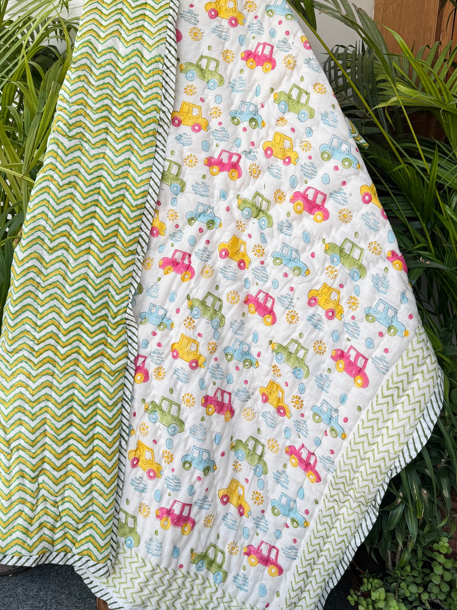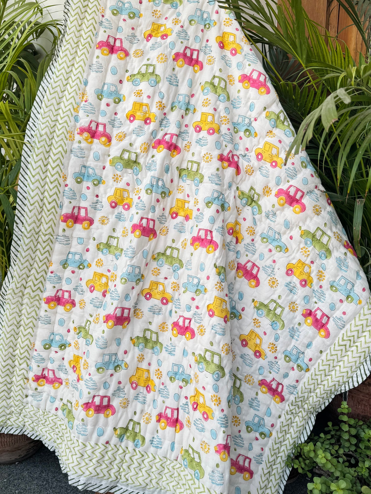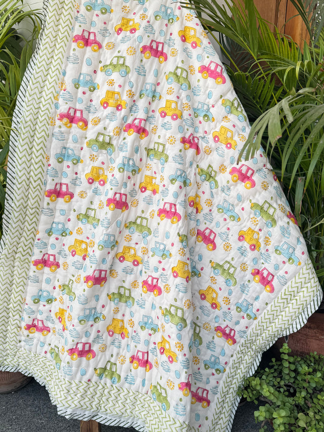 Car Racing Blockprint Kids Quilt - PREORDER Baby Size (40*40 inches) 0-2 yrs is backordered and will ship as soon as it is back in stock.