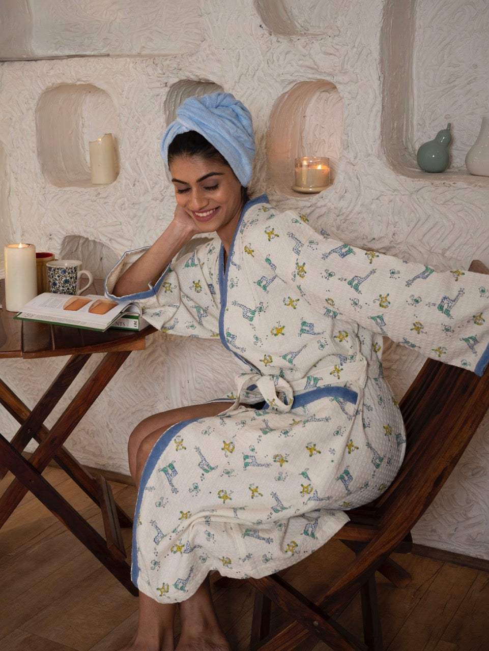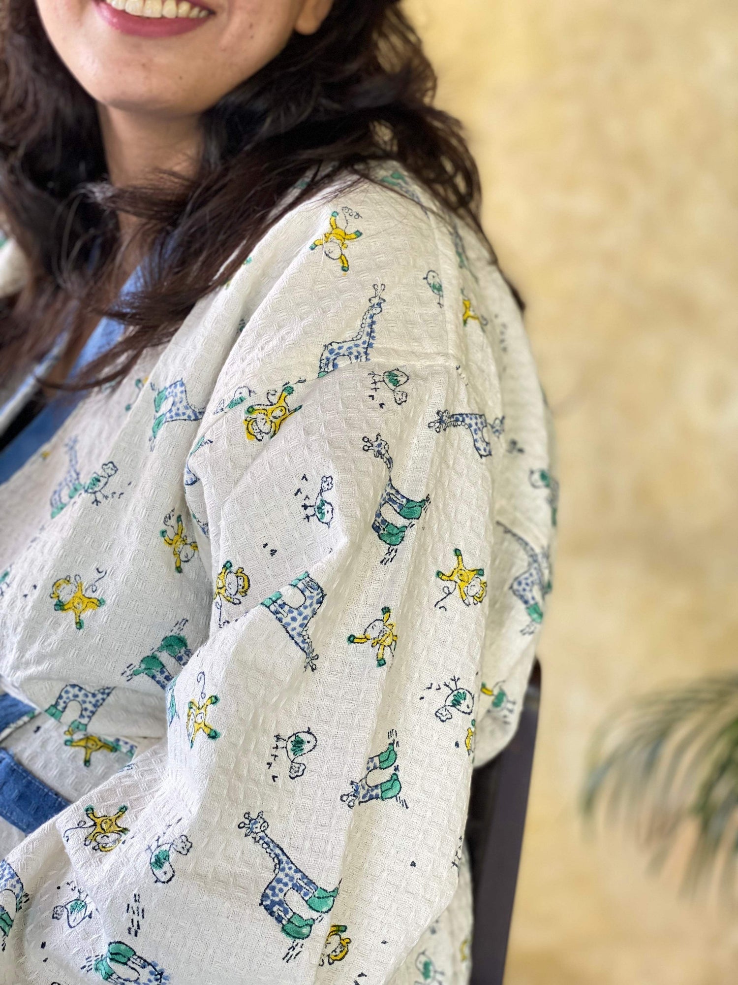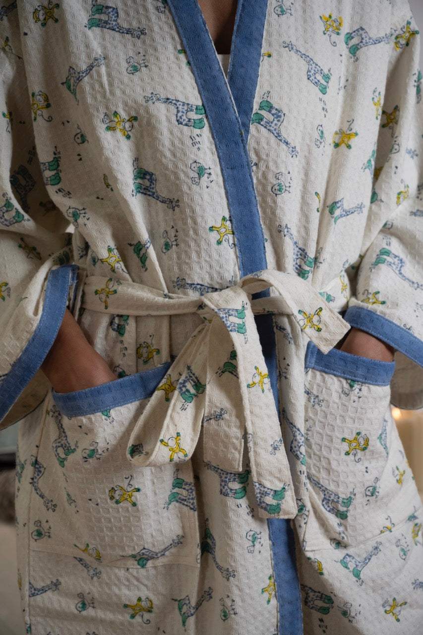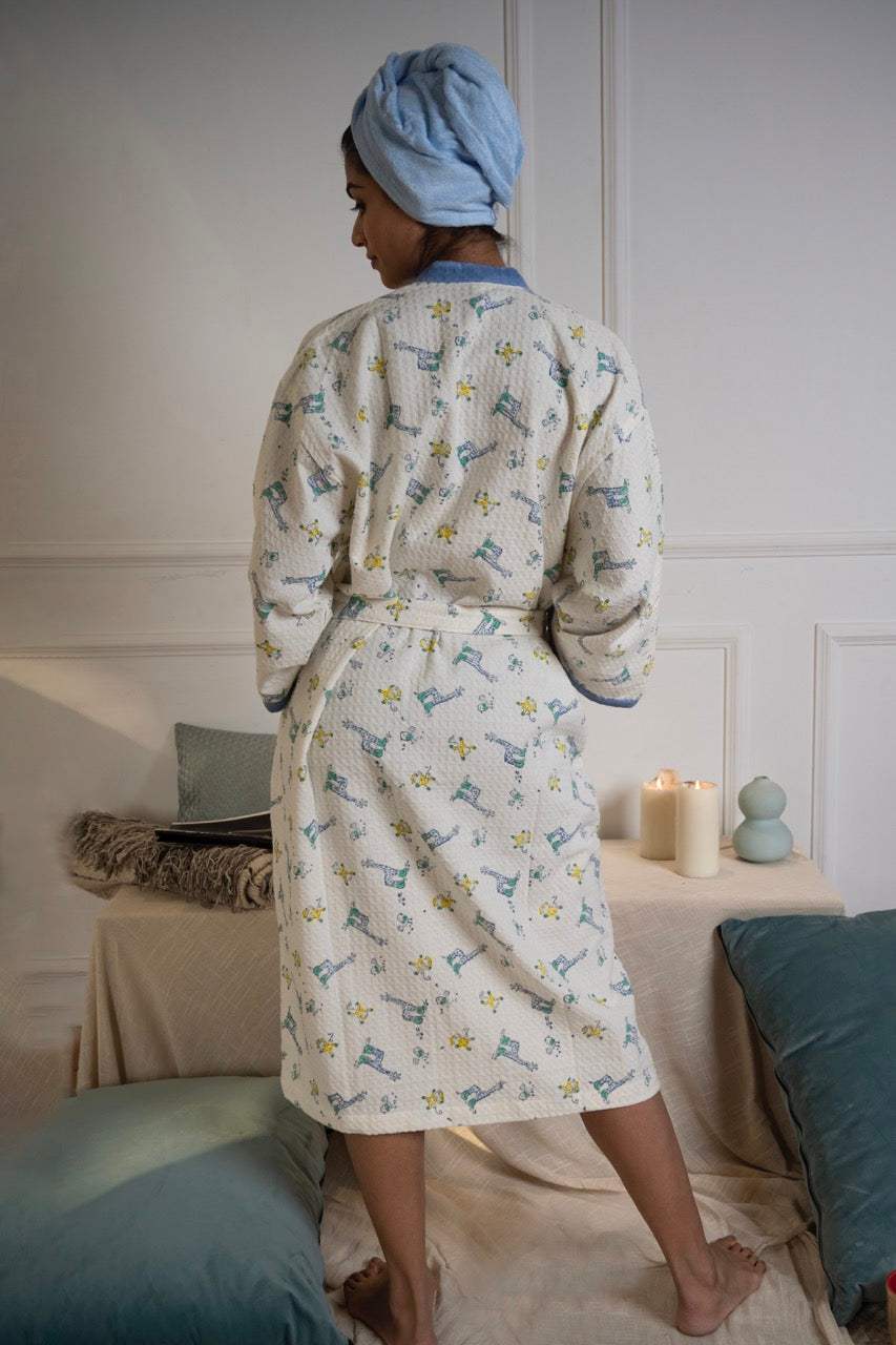 Animal Print Cotton Waffle Handblock Printed Bath Robe