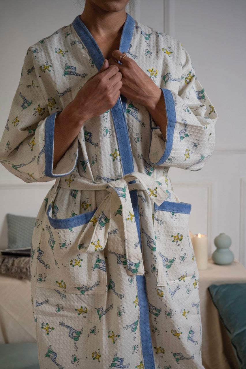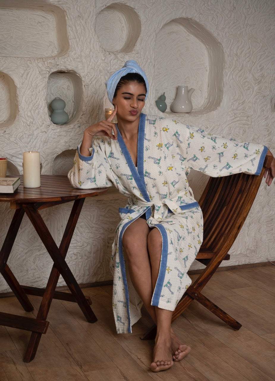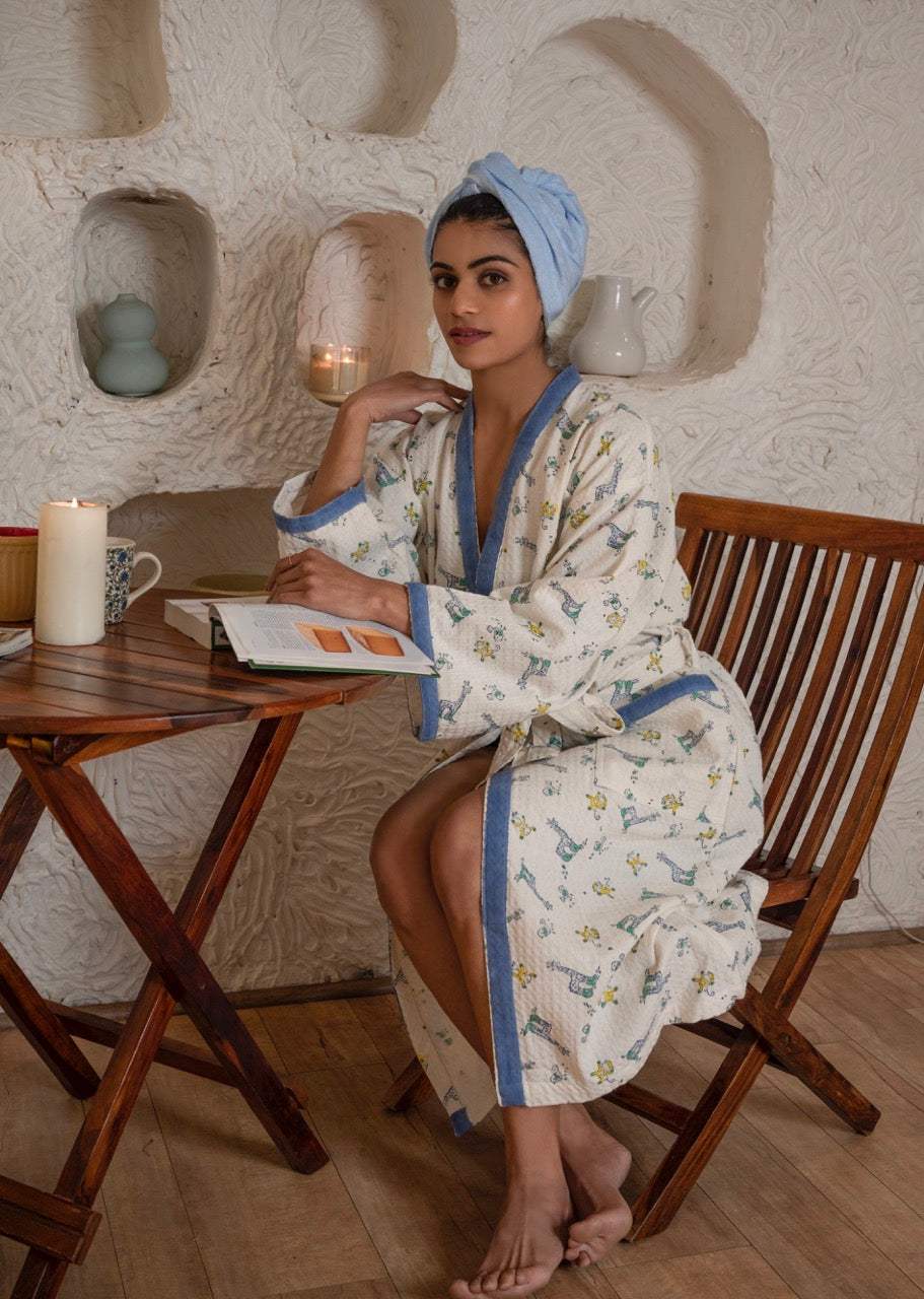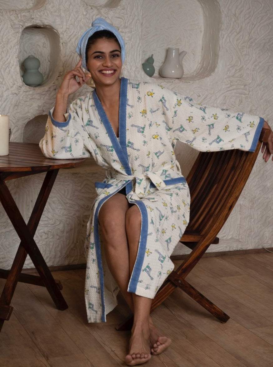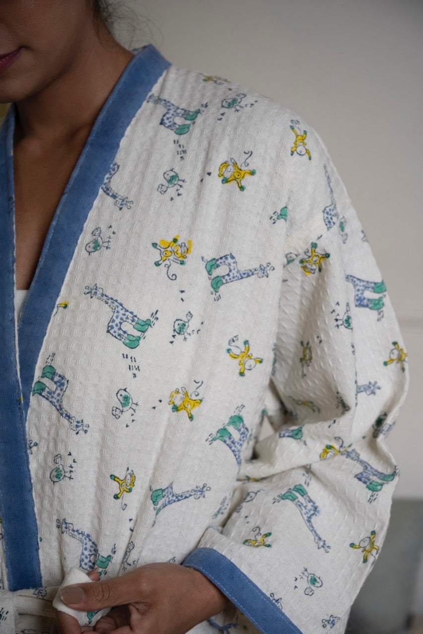 Animal Print Cotton Waffle Handblock Printed Bath Robe