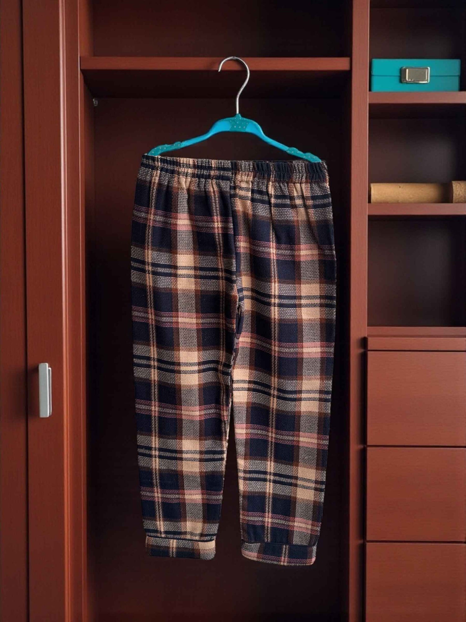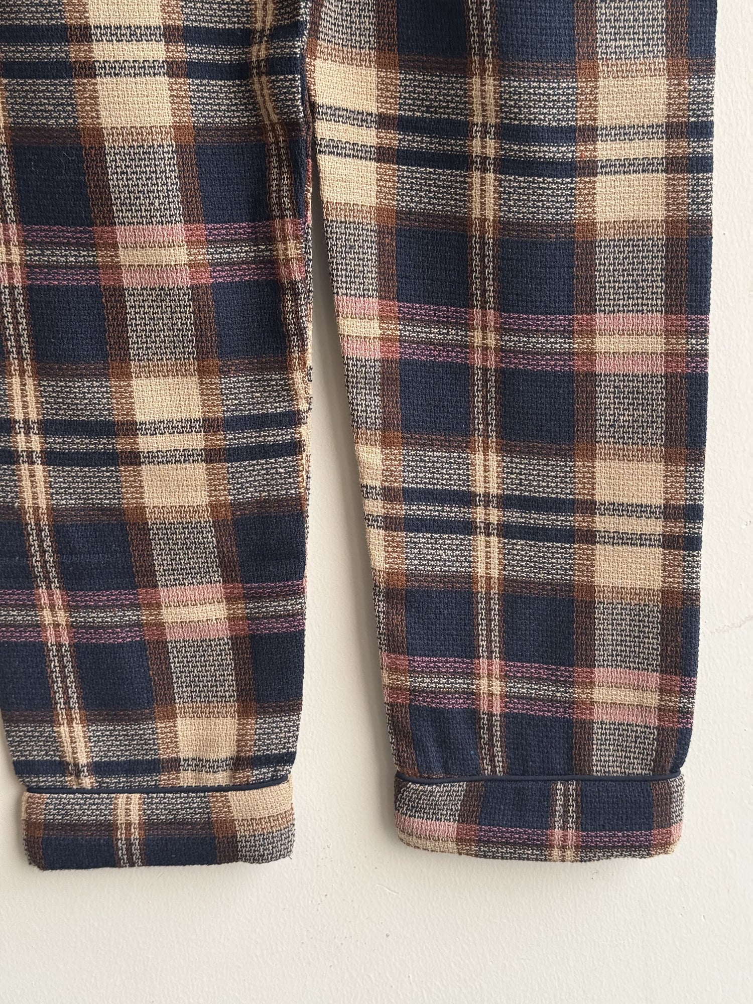 Cozy, classic, and made for carefree winter nights, this navy beige checked Winter night suit brings a touch of timeless charm to your little one’s bedtime routine. The nightshirt features neat contrast-piped details, a smart collar, and a handy chest pocket, all coming together to create a look that feels both playful and polished. Crafted from soft flannel, it keeps them warm without weighing them down, perfect for snuggles, story time, and long, restful sleep.