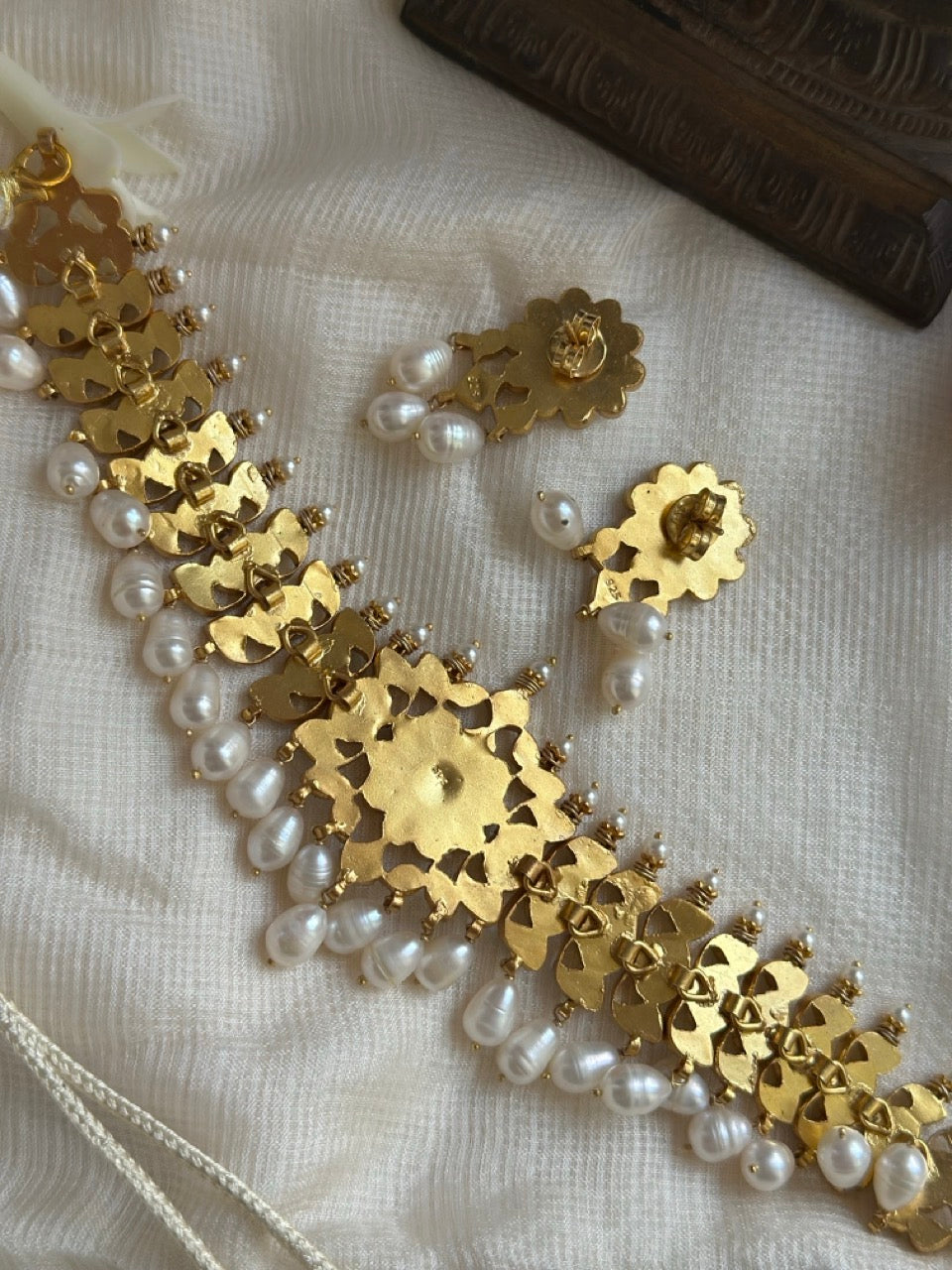 An elegant 92.5 sterling silver choker set, handcrafted with delicate Turquoise Kemp stones adorned with lustrous freshwater pearls. The floral motifs evoke timeless charm, while the subtle hues and pearl drops add a serene, royal touch — perfect for weddings and festive celebrations.