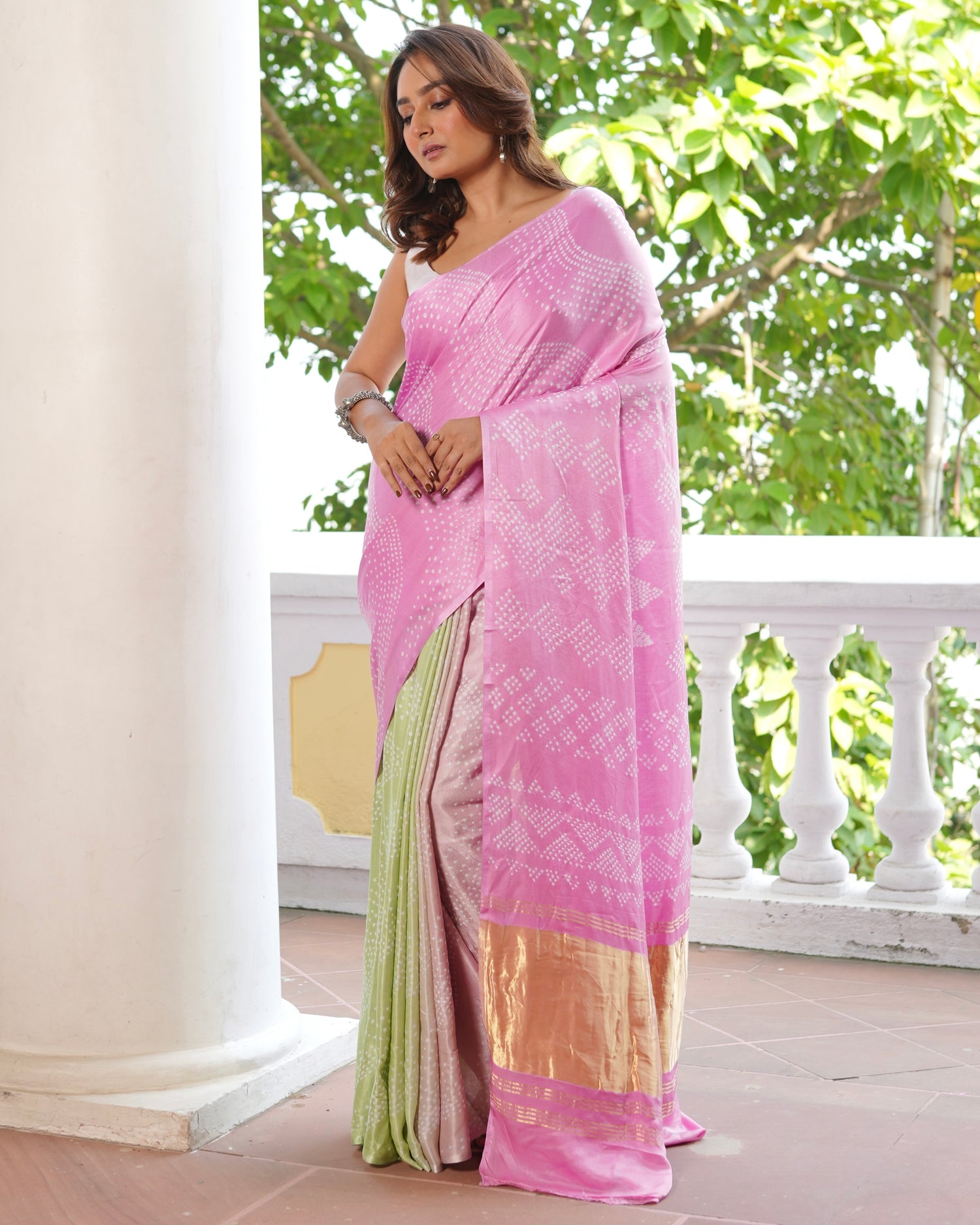 Crafted from the luxurious Gajji silk, this Bandhani saree blends delicate shades of pink and green with effortless harmony. The soft silk surface features traditional white motifs arranged in graceful symmetry, adding depth to the pastel hues. The pink pallu flows into a gentle green pleated base, creating a refined dual-tone contrast.