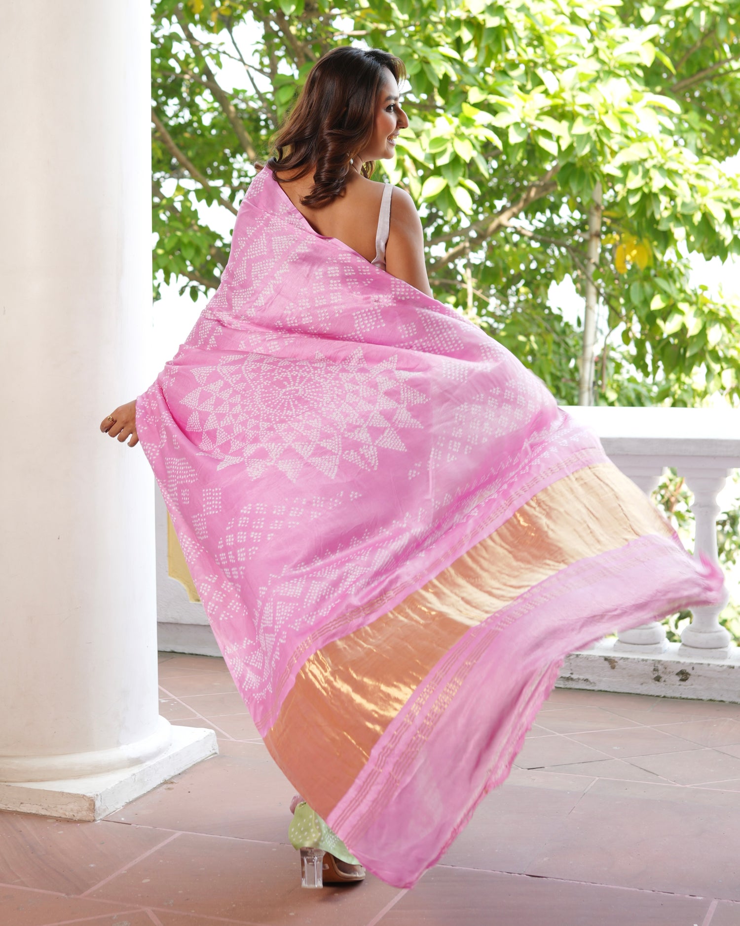 Divine Pink Green Bandhani Pure Gajji Silk Saree
