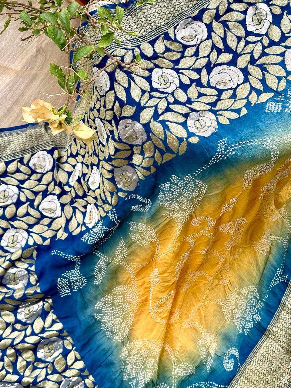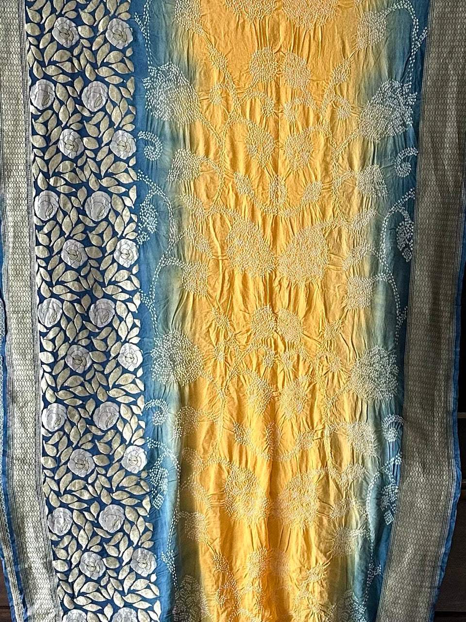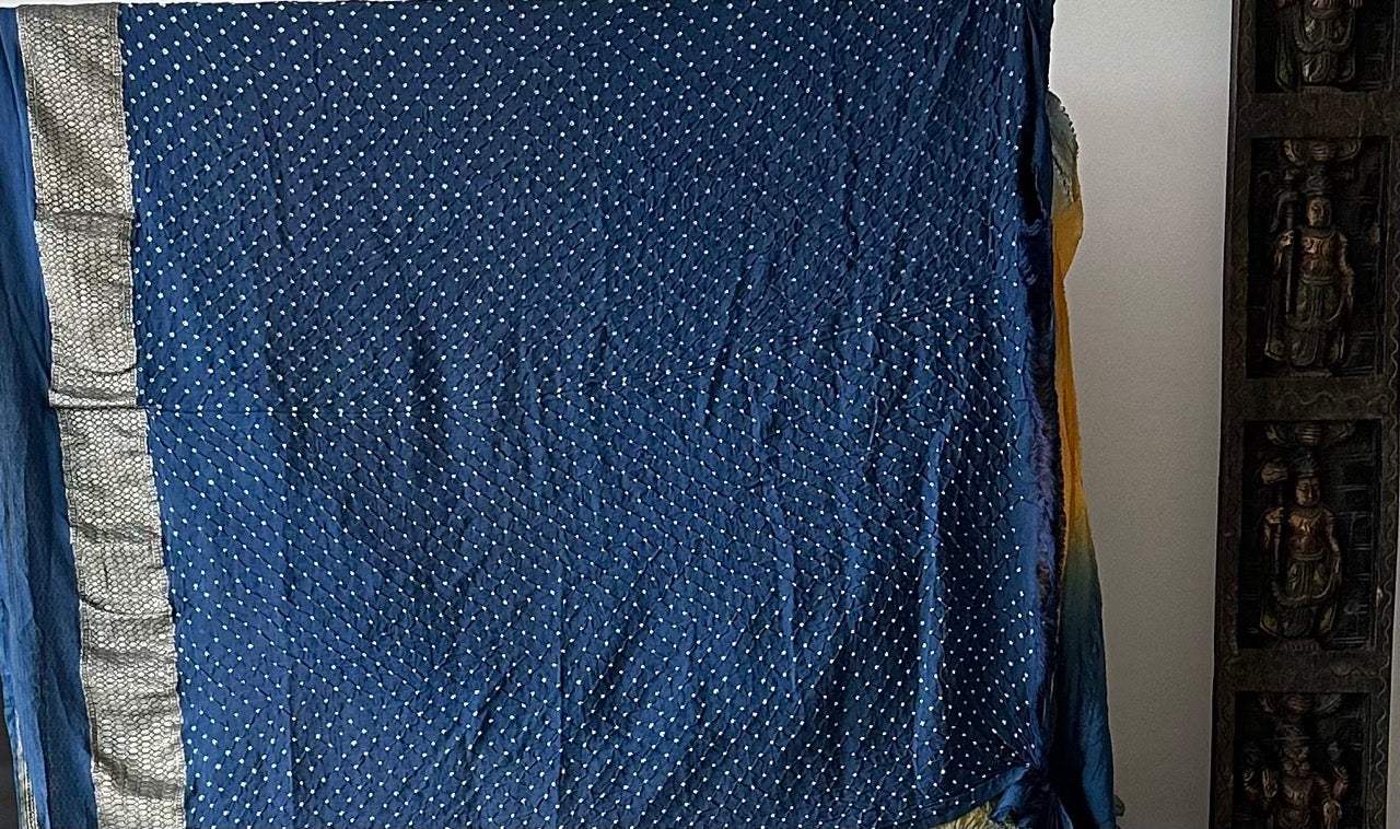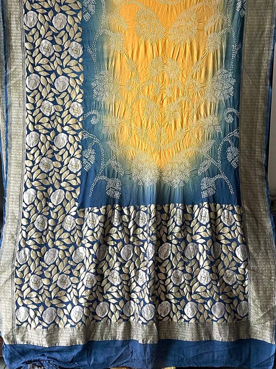 Dual Shade Blue and Yellow Exclusive Handloom Pure Banarsi Georgette Bandhani Saree is backordered and will ship as soon as it is back in stock.