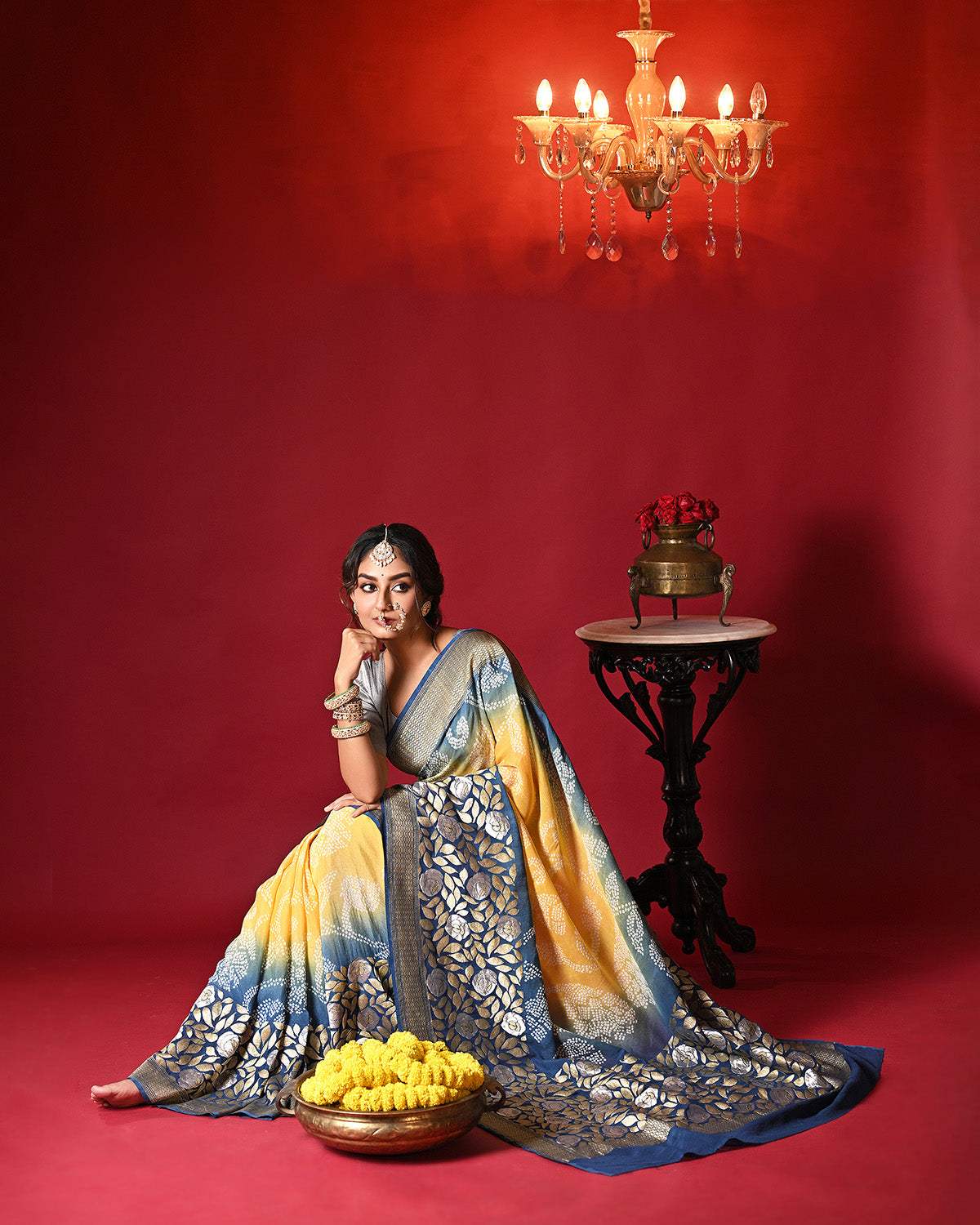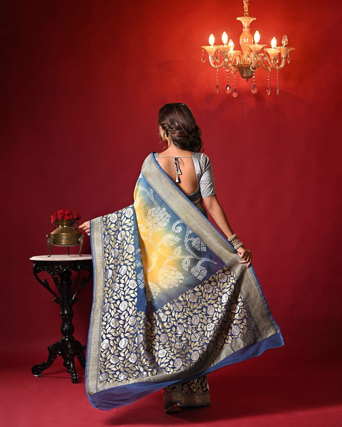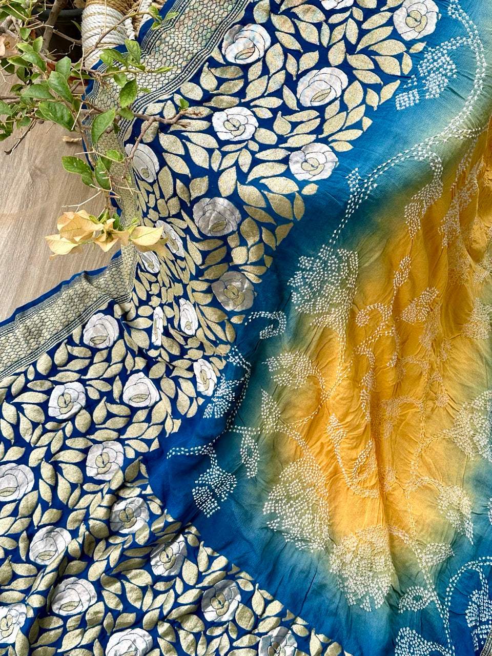 Dual Shade Blue and Yellow Exclusive Handloom Pure Banarsi Georgette Bandhani Saree is backordered and will ship as soon as it is back in stock.