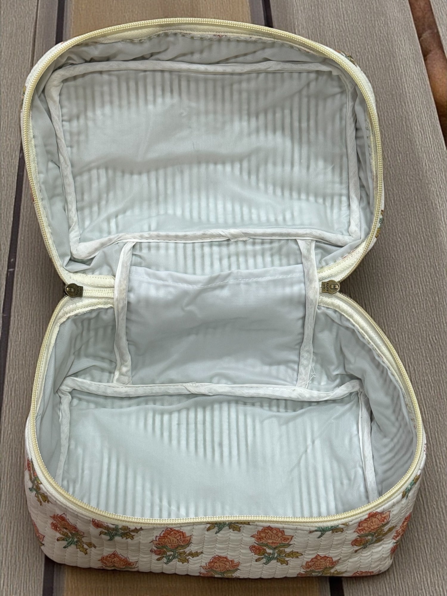 Bring home the charm of Jaipur’s handblock printing with our quilted vanity kit, a beautiful blend of tradition, craftsmanship, and everyday utility. Made from 100% cotton fabric with soft cotton filling, this handcrafted vanity pouch is durable, lightweight, and full of character. The inner lining features a smooth, noise-free plastic layer that’s easy to clean and gentle to touch. Finished with a matching contrast zipper and a comfortable handle, this cotton makeup bag or toiletry pouch is perfect for keeping your cosmetics, skincare, jewelry, innerwear, or travel accessories organized in style — at home or on the go.