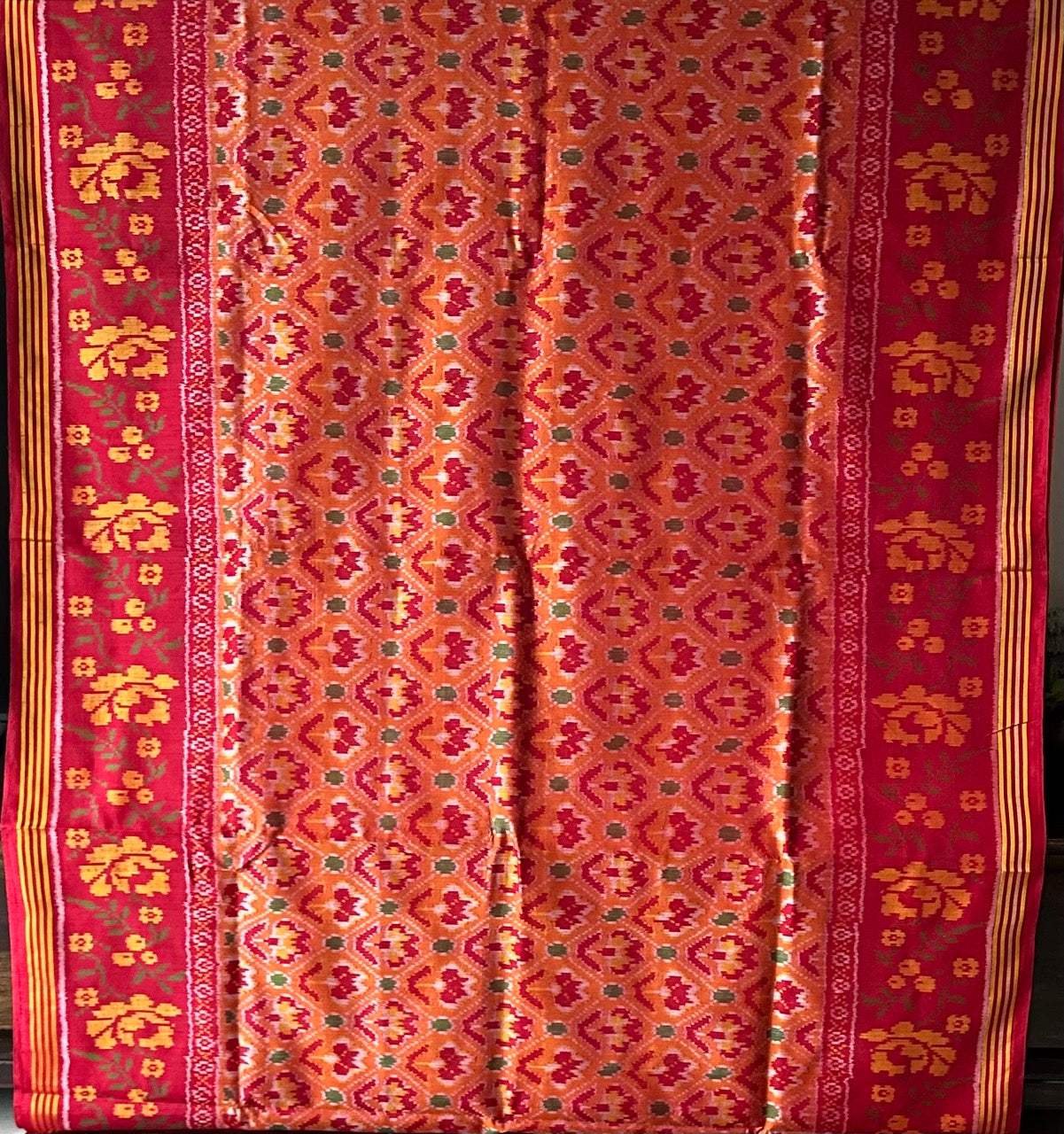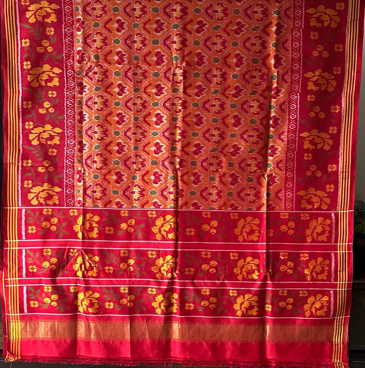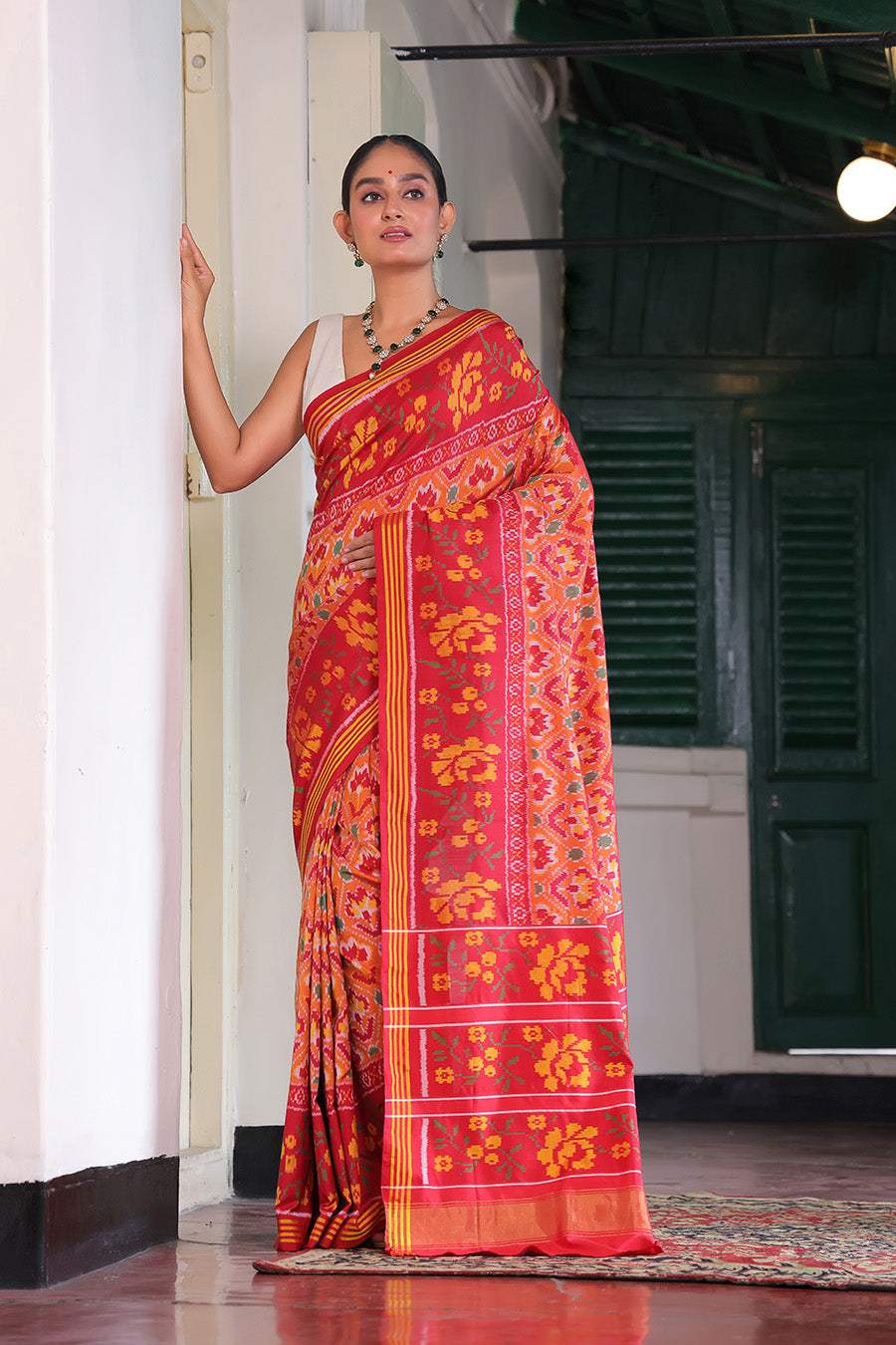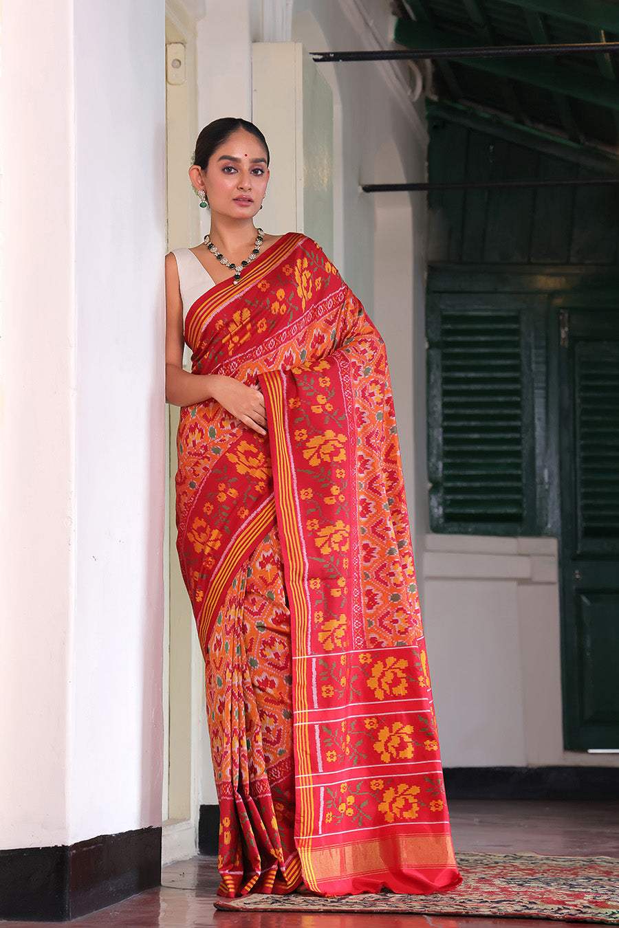 Elegant Handloom Peach and Red Mulberry Silk Ikat Patola Saree with Floral Motifs