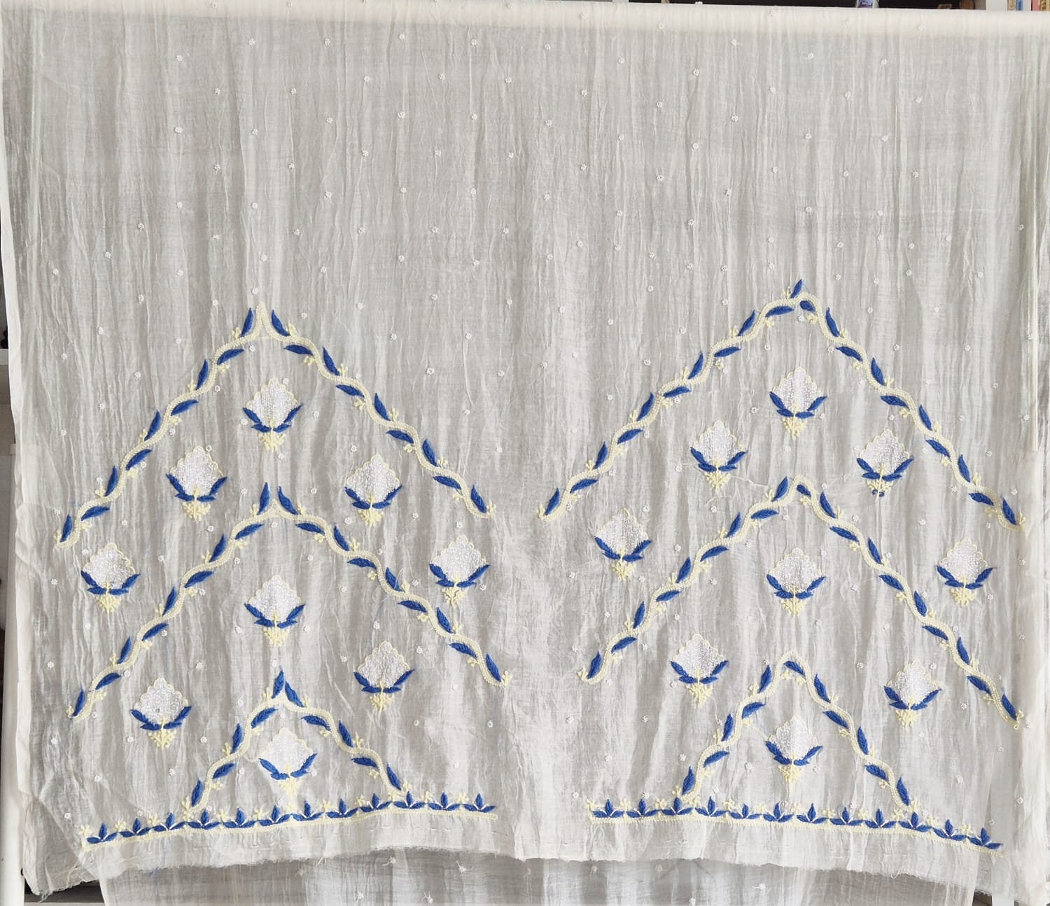 This unstitched suit set is made for days when comfort matters as much as detail. The mulmul fabric feels light and breathable, ideal for warmer weather. Set on a milky white base, the hand-embroidered Chikankari floral jaal in soft blue and yellow brings in colour without feeling loud.