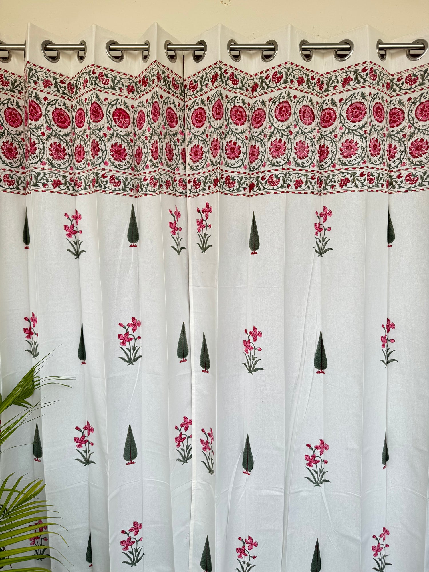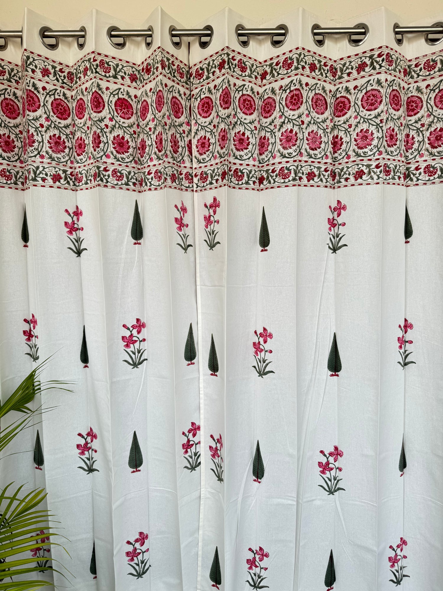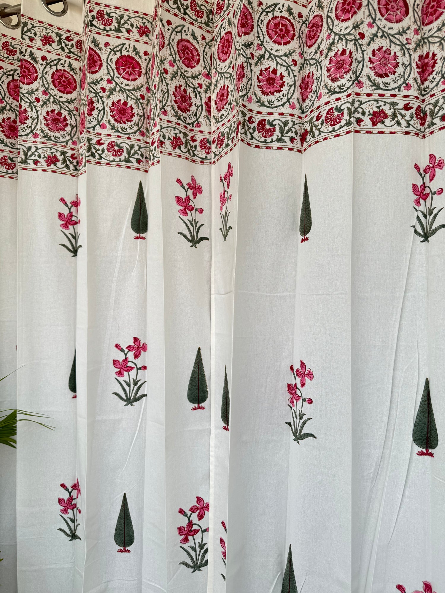 Elegant Pink Floral Blockprint Cotton Curtain - 7ft long is backordered and will ship as soon as it is back in stock.