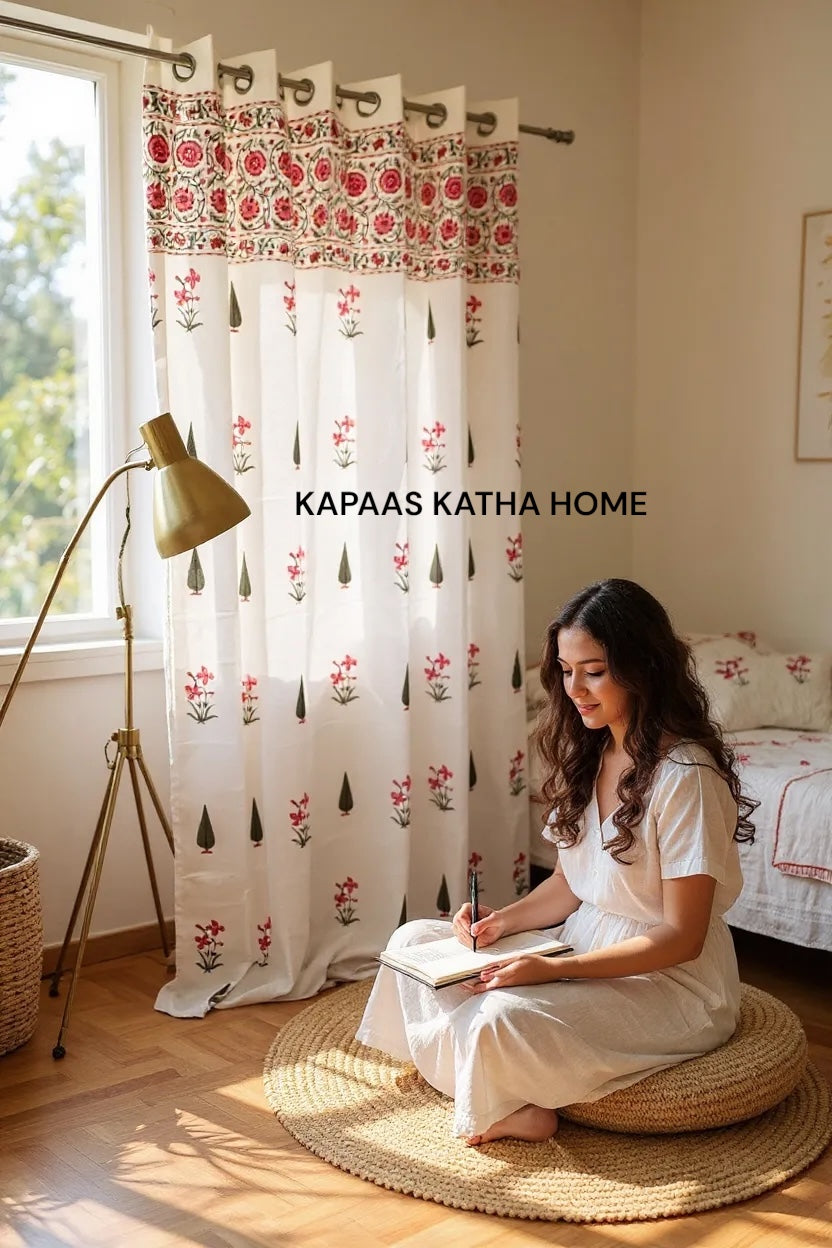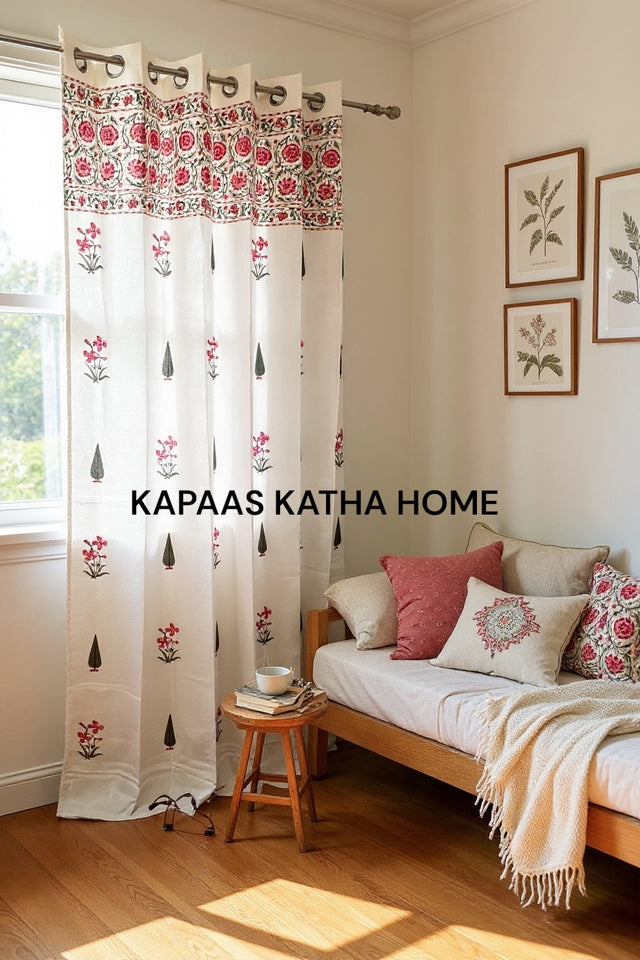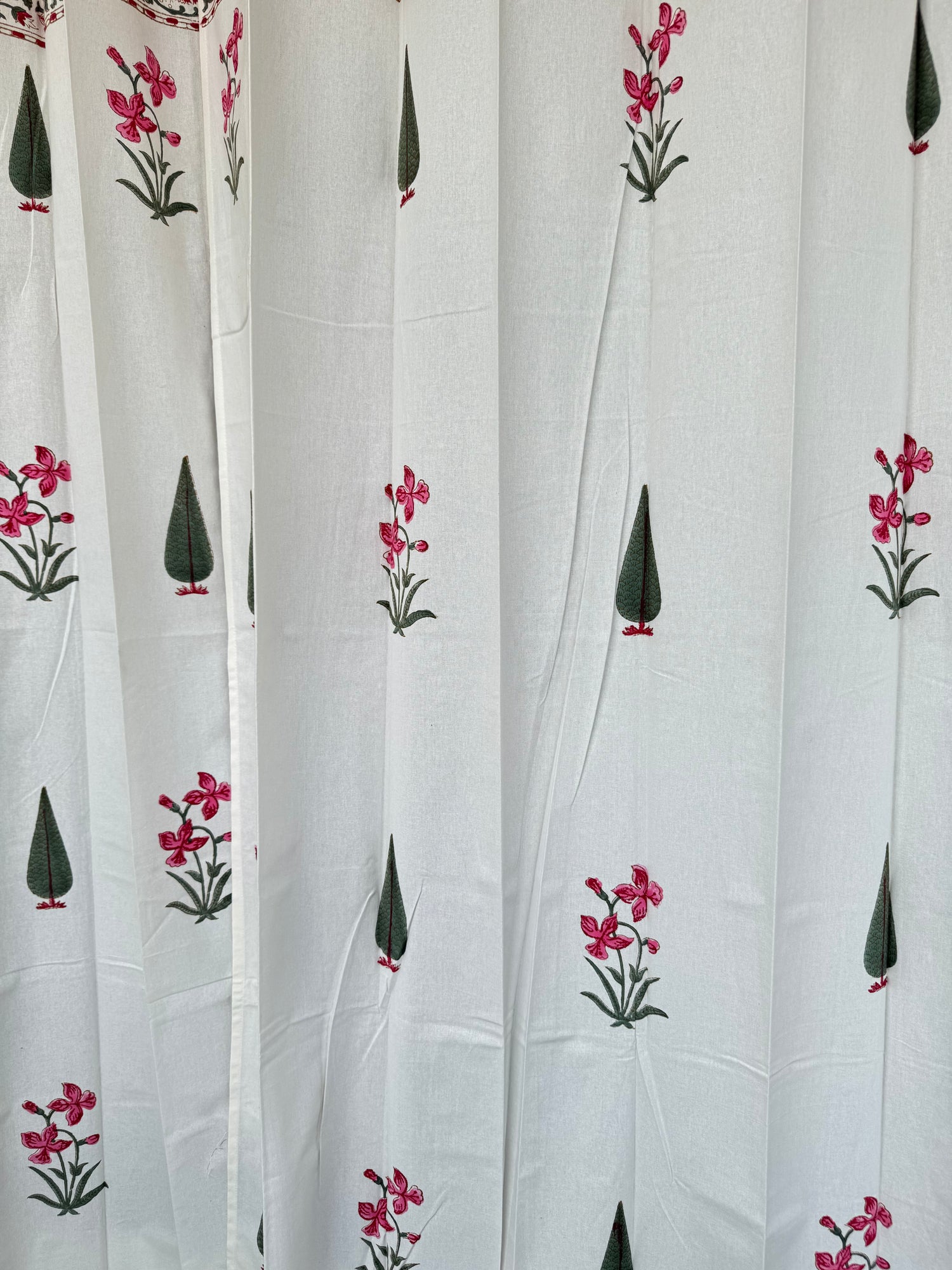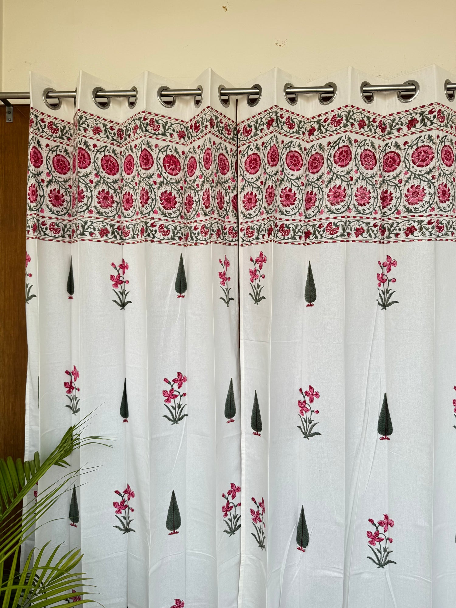 Elegant Pink Floral Blockprint Cotton Curtain - 7ft long is backordered and will ship as soon as it is back in stock.