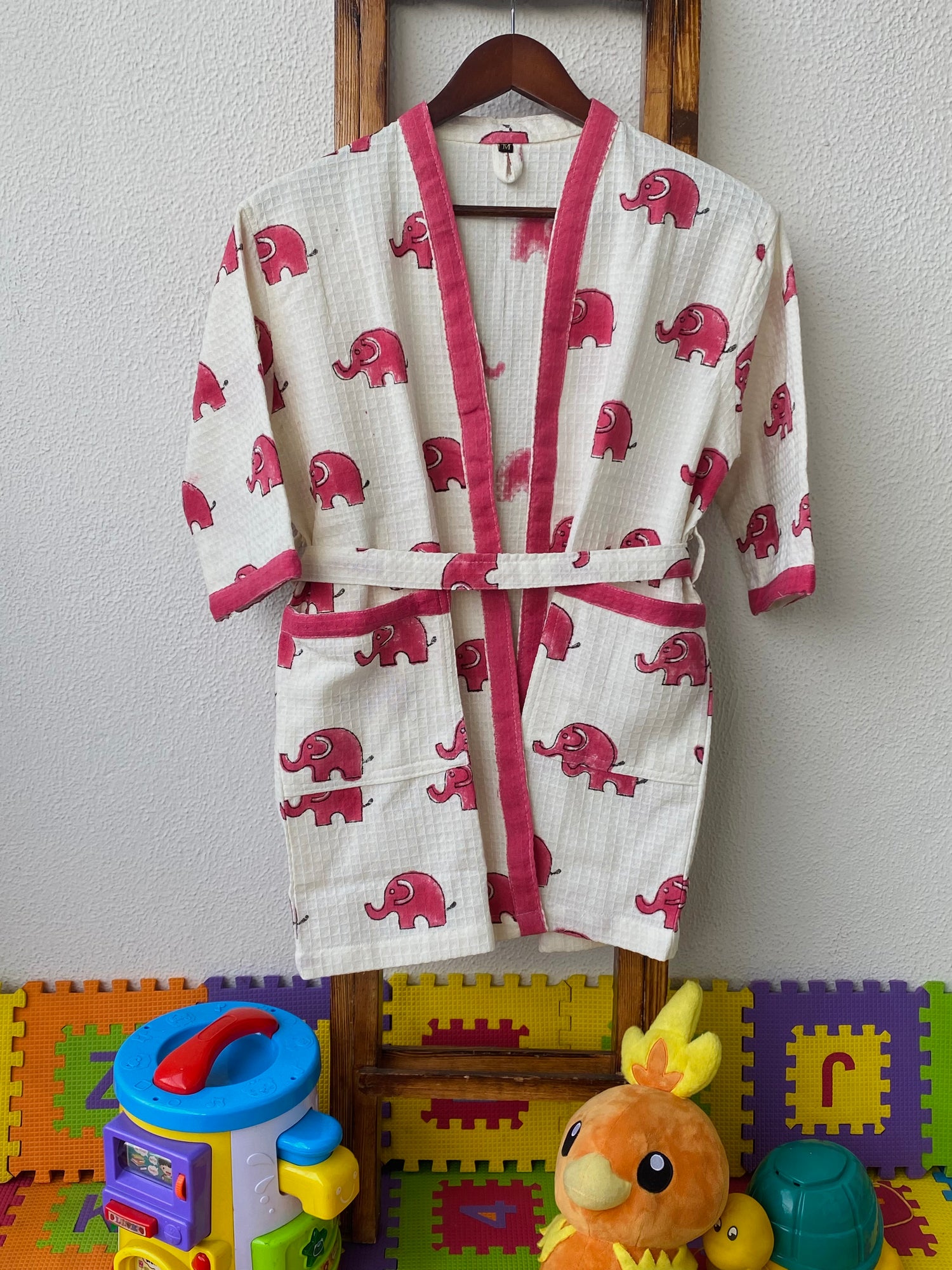 Wrap your little one in softness and charm with our Cute Elephant Theme Cotton Waffle Bathrobe, handblock printed by expert artisans from Jaipur. made of pure cotton waffle weave, it is lightweight, super absorbent, and gentle on delicate skin — making it ideal for daily use after showers, swimming classes, beach vacations, summer camps, and lounging comfortably at home.