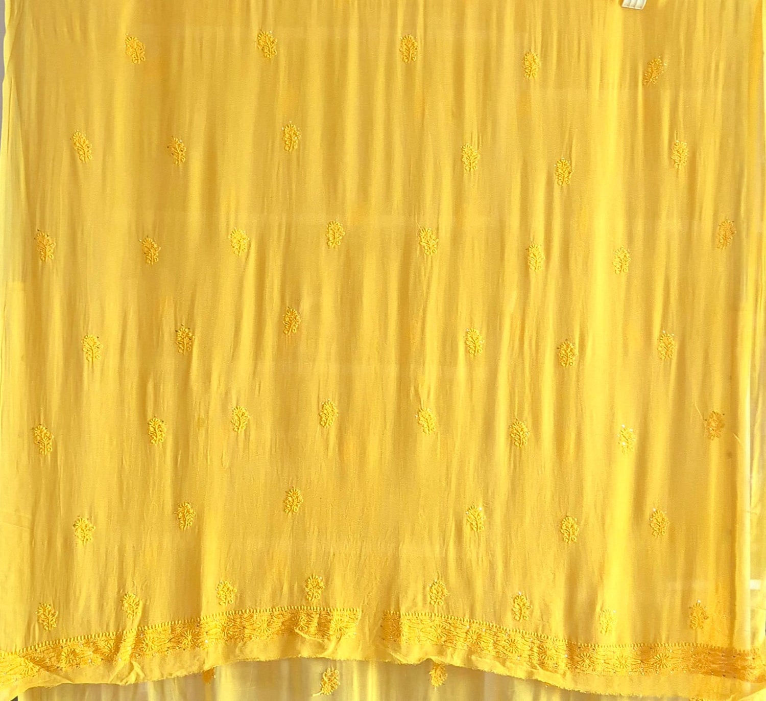 This exclusive and luxurious Chikankari piece on georgette is perfect for every occasion, with heavy jaal on front, small boota on the back and sleeves with small border. Kurta fabric is adorned with sophisticated Chikankari, and Mukaish embroidery
