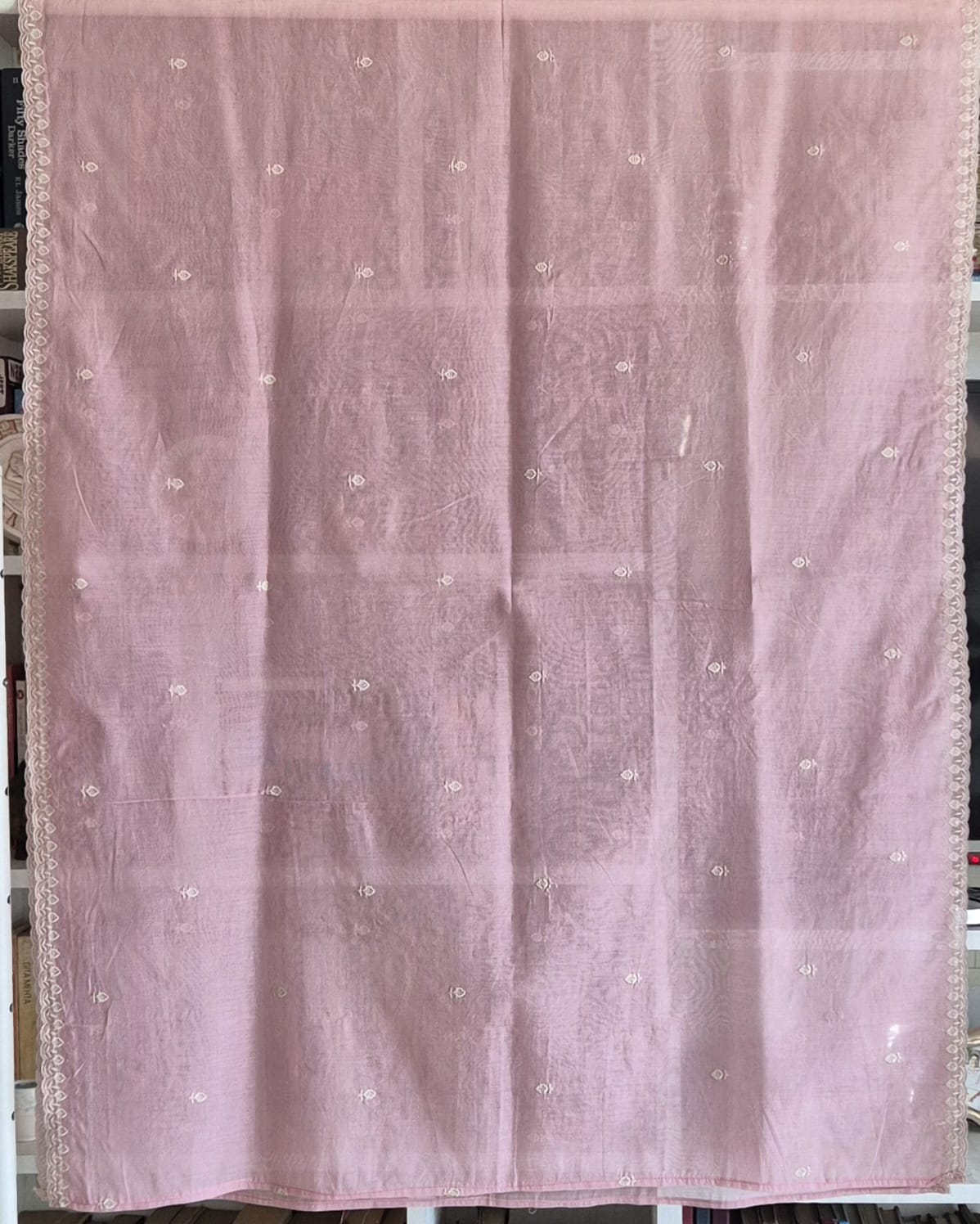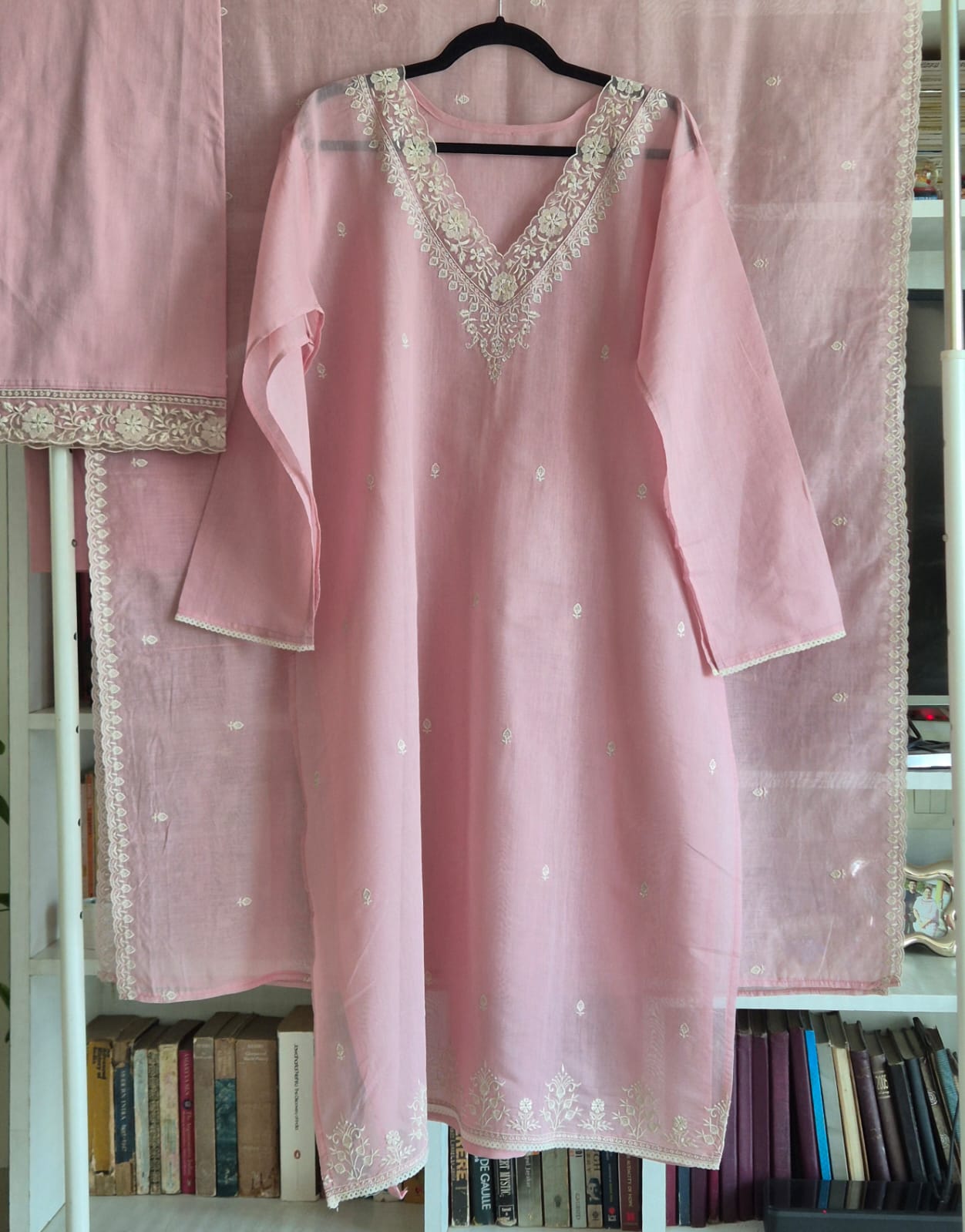Three piece semi stitched suit set with machine embroidery. The back of the suit is plain.