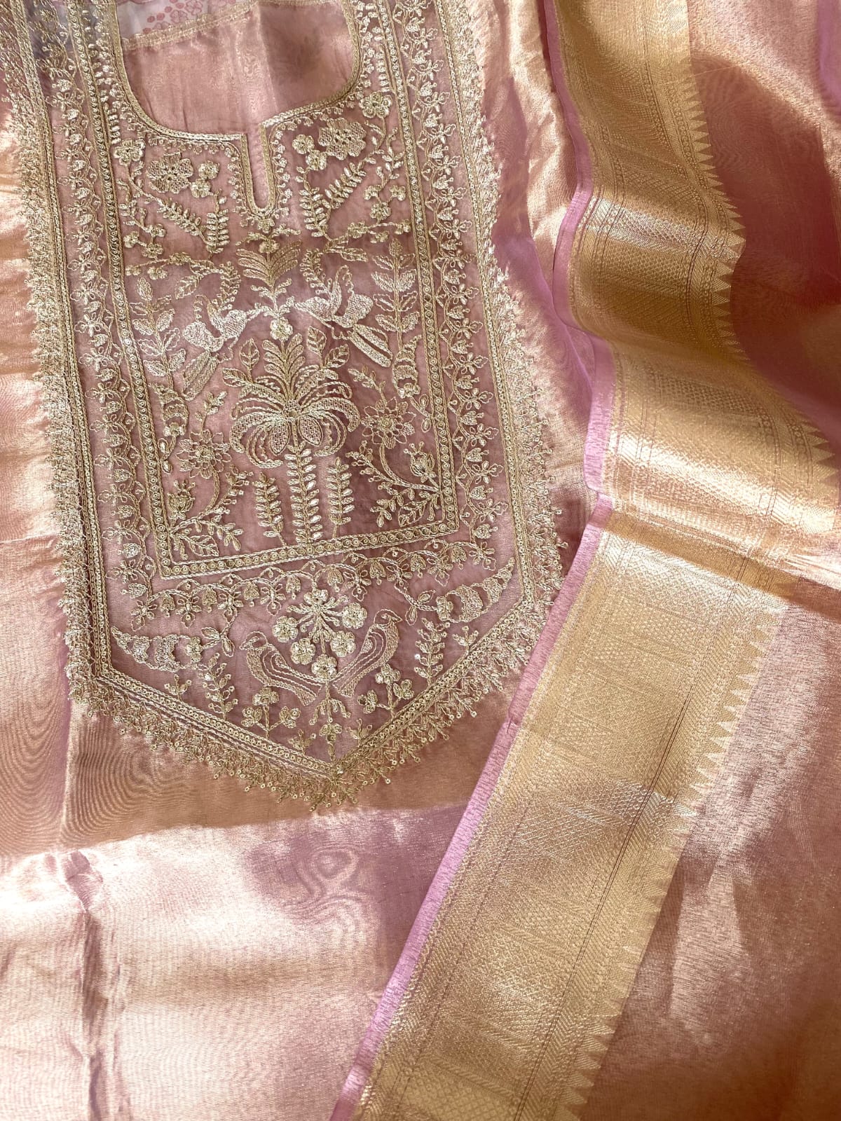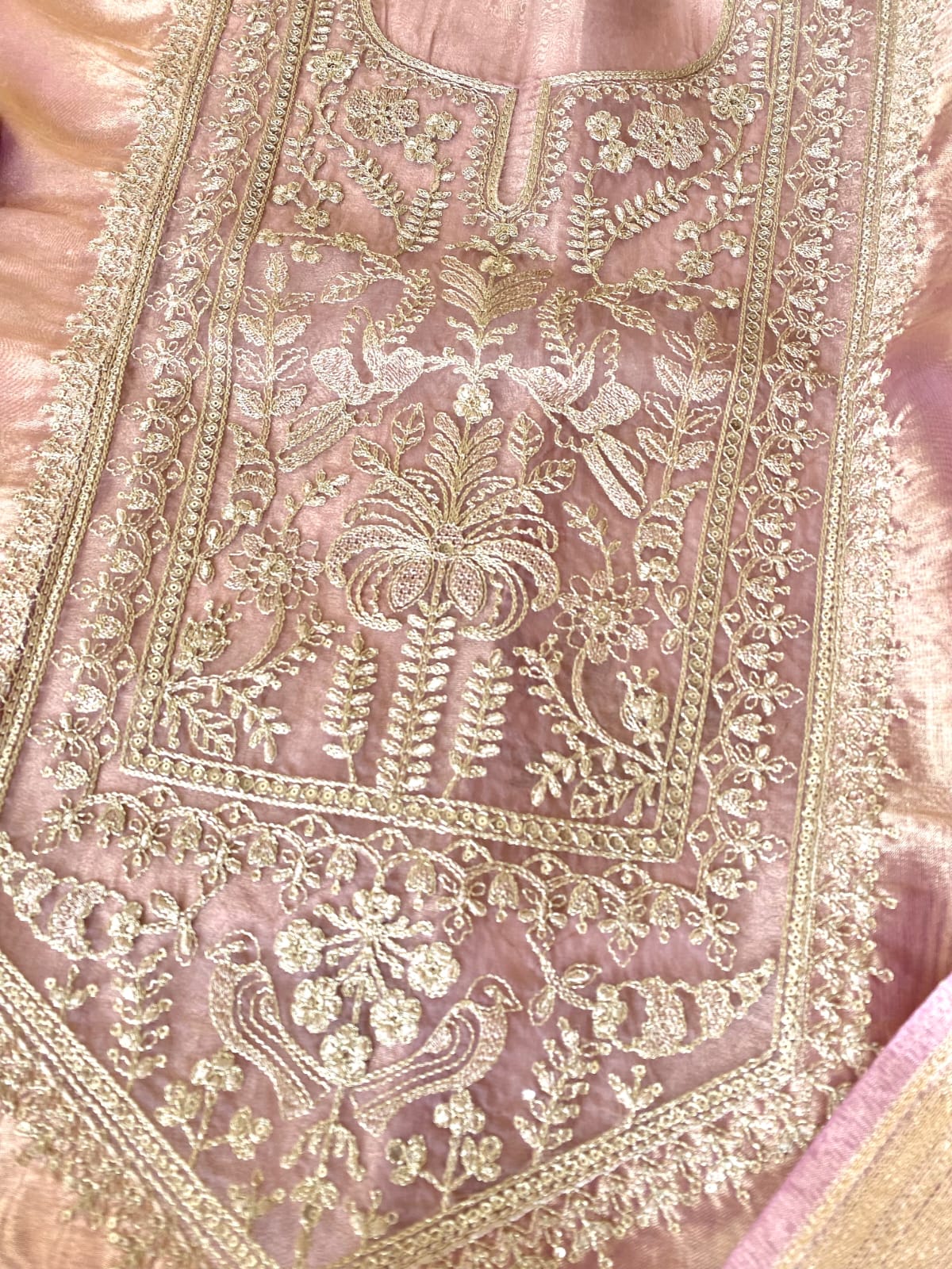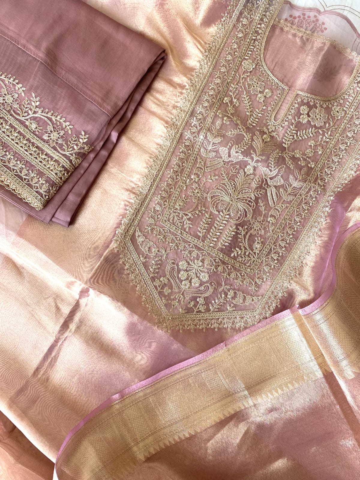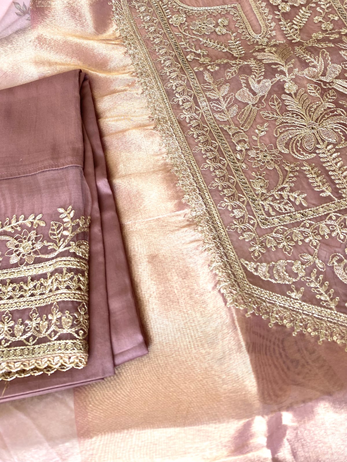 Three-piece unstitched tissue suit set with machine embroidery. The back of the suit is plain. Please note this is an Unstitched suit set.